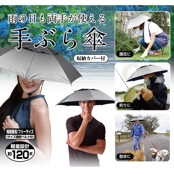 TV等でも紹介された、かぶる日傘。両手が塞がらない!!とっても便利♪多少の雨でも防げるので野外活動時の突然の雨でも大丈夫!紫外線もカットできて、安心。野外活動時の日傘として。畑などの農作業時に。釣りなどのレジャーに。※両手が自由になるので便利◎※調整ゴムバンドですが、おでこから耳の上で帽子のようにかぶるようにはめますが、決して顎に引っ掛ける物ではありません。あご紐は青紫の紐が別にあります。【サイズなど】頭囲:サイズ調整可能で、ゴムでも伸縮しますので、ご自分の頭に合わせてご使用いただけます。※頭囲に関しましては、通常のCAPとは違い風対策などもあり、強めのホールドを出来るようになっております。傘を開いた時の直径:約70cm×20cm傘を閉じた時の長さ:約42cm重さ:約120g傘生地:ポリエステル100%材質:ポリエステル、スチール、ポリプロピレン生産国:中国製【注意事項】※発送は送料を抑える為、定形外郵便での発送で追跡番号等の無い発送方法になりますので、ご理解の上ご購入ください。梱包も簡易梱包で商品をプチプチで包んでの発送にさせていただきますので、ご了承ください。※定形外郵便でも別途手数料をいただければ、配達証明付きにしての発送も可能ですので、必要な場合はご購入時にお問い合わせください。※送料をご負担いただければ、宅配便での発送も可能ですので、その場合はご購入時にお問い合わせください。※モニターの発色の具合によって実際のものと色が異なる場合があります。※こちらの商品は新品未使用品ですが、極少の汚れや、傷、色ムラなどがある場合が稀にありますが、ご使用に問題が無い場合はご了承ください。※ご使用は、商品パッケージに記載されている使用上の注意等を良く読んでご使用ください。※記載できていない部分もございますので、ご不明点等ございましたら、お気軽にお問い合わせください。