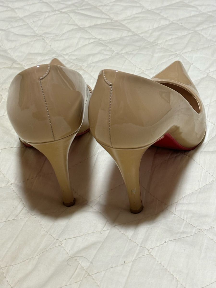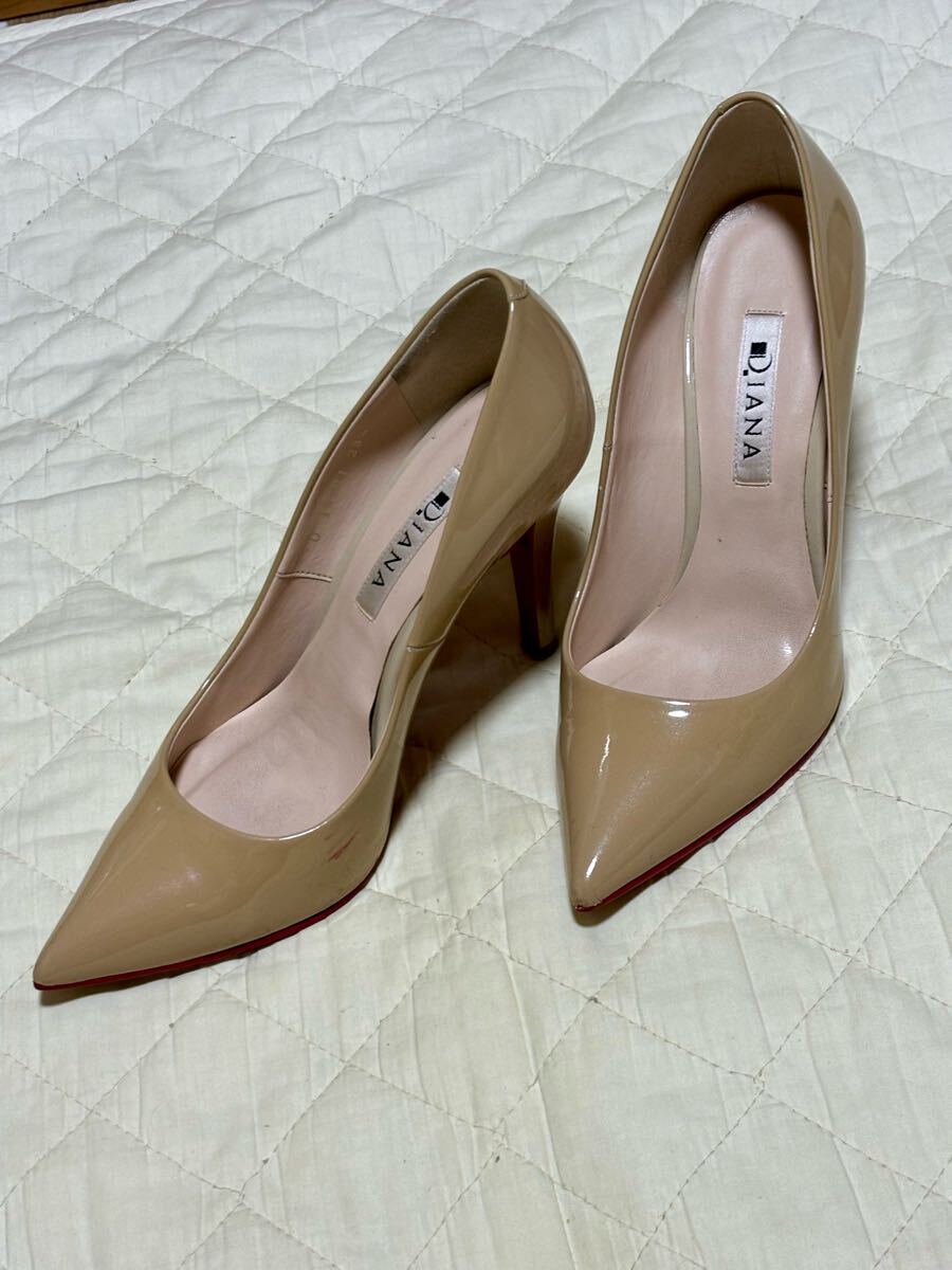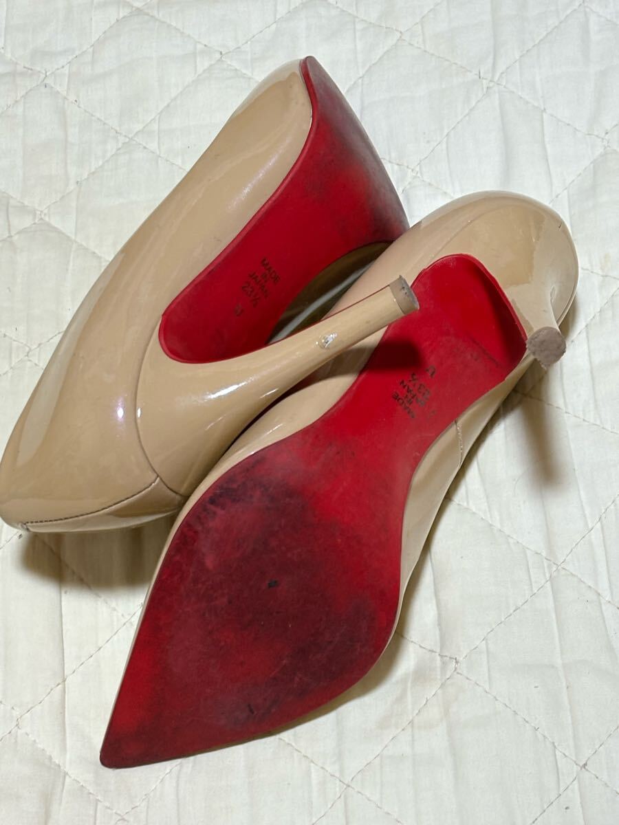 綺麗なポインテッドトゥのピンヒールパンプスです。カフェ・オ・レの様な色ですが良く見るとパール仕上げなので光が当たると素敵です。