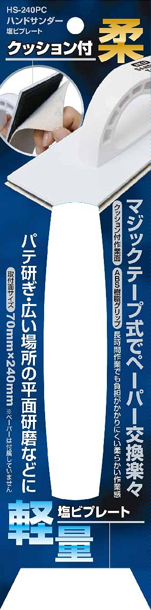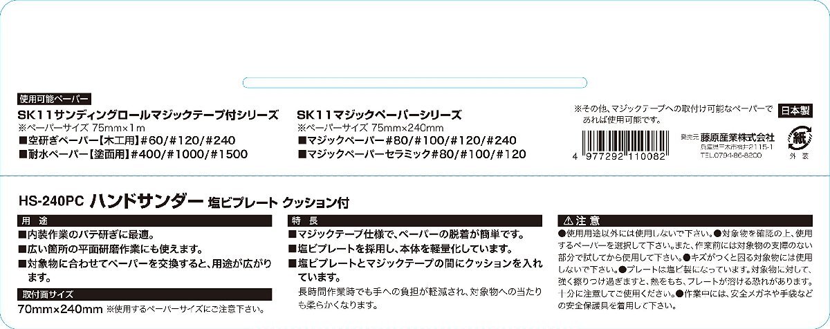 説明 パテ研ぎ・広い箇所の木工研磨などの研削・研磨作業用のハンドサンダー 【本体サイズ】 幅/70x高さ/240x奥行/65 mm 【用途】 研削・研磨作業 【特徴】 ・ペーパーの脱着はマジックテープ式で簡単に交換、取り付けが可能 ・本体プレートが塩ビ製のため、軽量になっている ・プレートとマジックテープとの間にクッションを入れることで、作業中の対象物へのあたりを柔らかくすることが出来る 【注意事項】 ※ペーパーは付属しておりません。別売のマジックテープ対応ペーパーを取り付けご使用下さい。 弊社のSK11サンディングロールマジックテープ付シリーズ、マジックペーパーシリーズに使用可能 ※ペーパー取付サイズ(プレートサイズ:70x240mm)を確認してから使用して下さい。 ※作業を行う際には、手袋・安全メガネなどの保護具を着用して下さい。