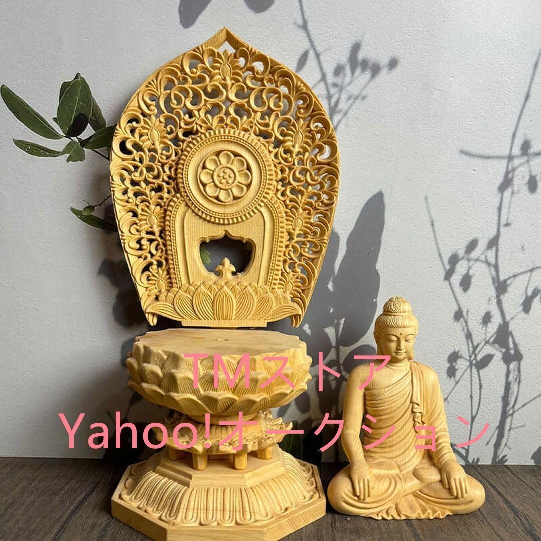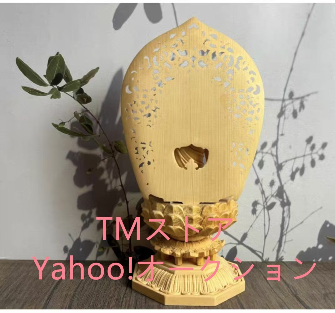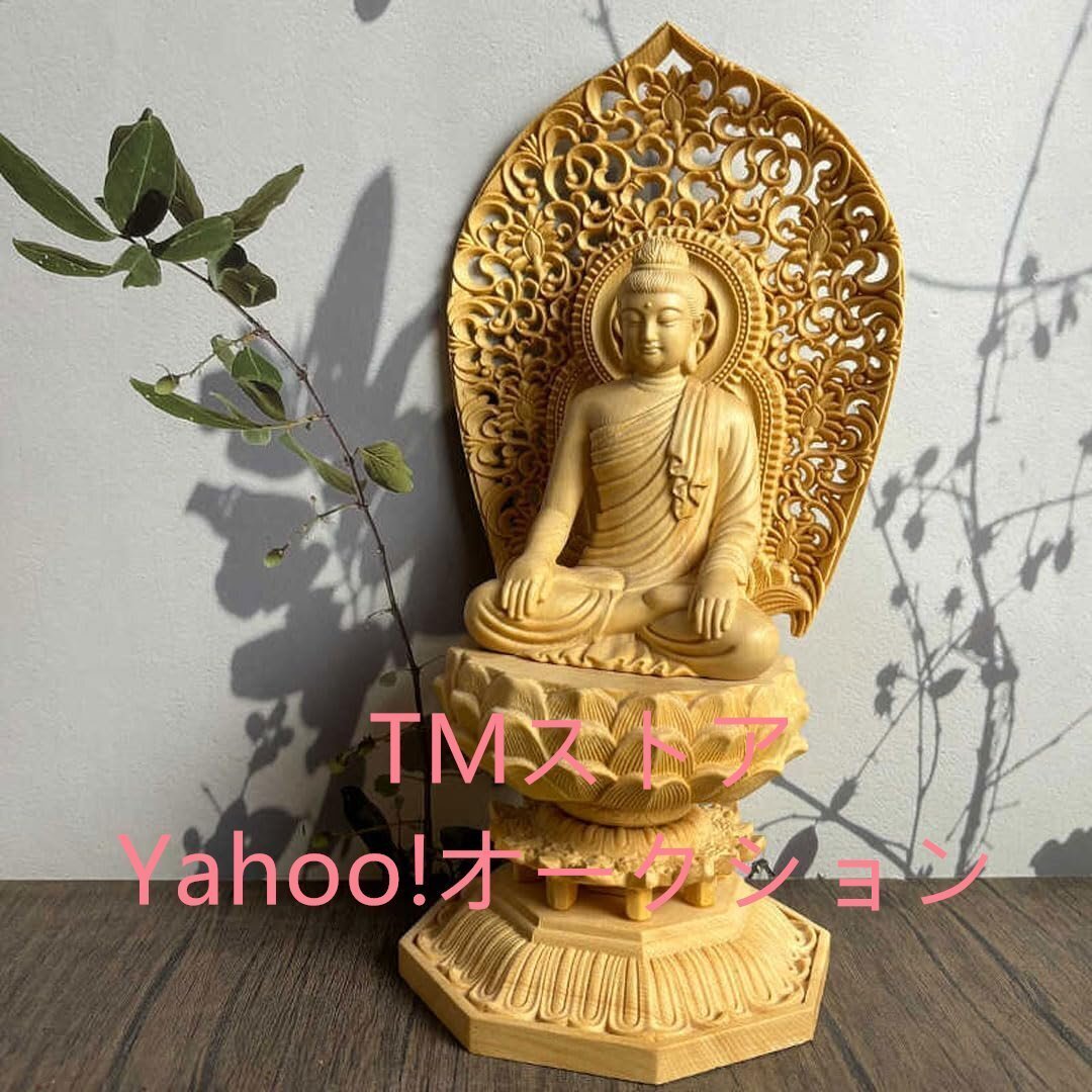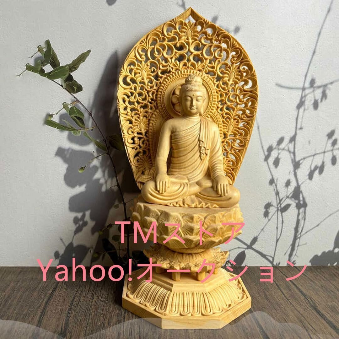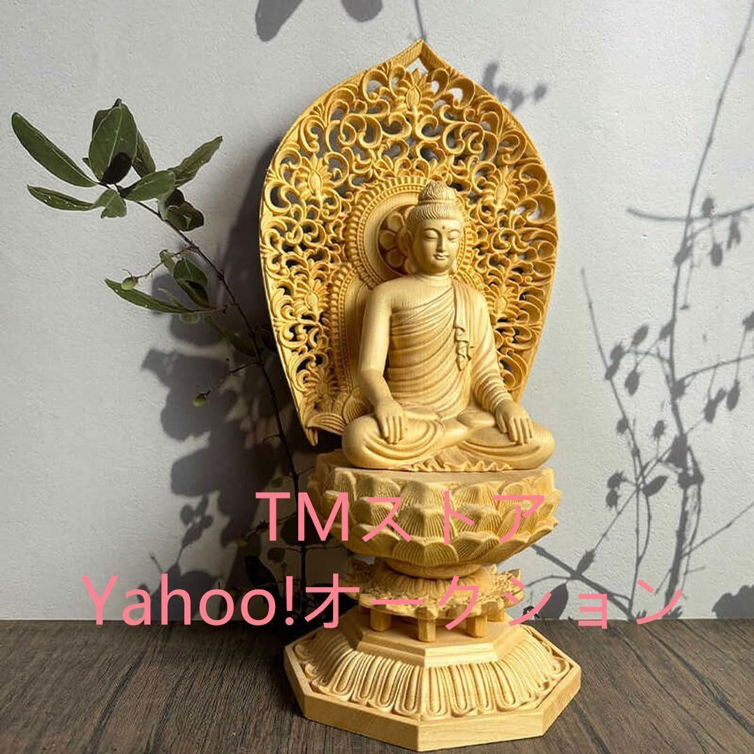 仏像【釈迦如来座像】 曹洞宗・臨済宗・天台宗 桧木製高級木彫り 六角台座 唐草光背 木彫りの仏像(総高28cm、幅12cm、奥行き12cm)