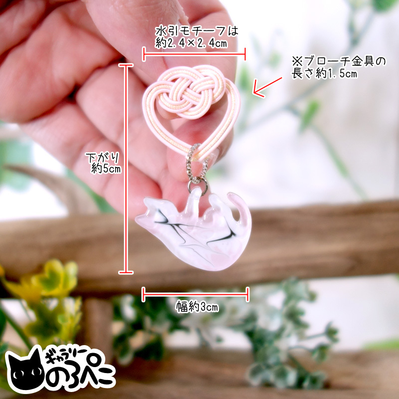 水引の花と猫ちゃんのブローチ(水引とレジンの猫ちゃんのブローチ・ピンクのハート型の花とマーブル猫ちゃん) bc877-3