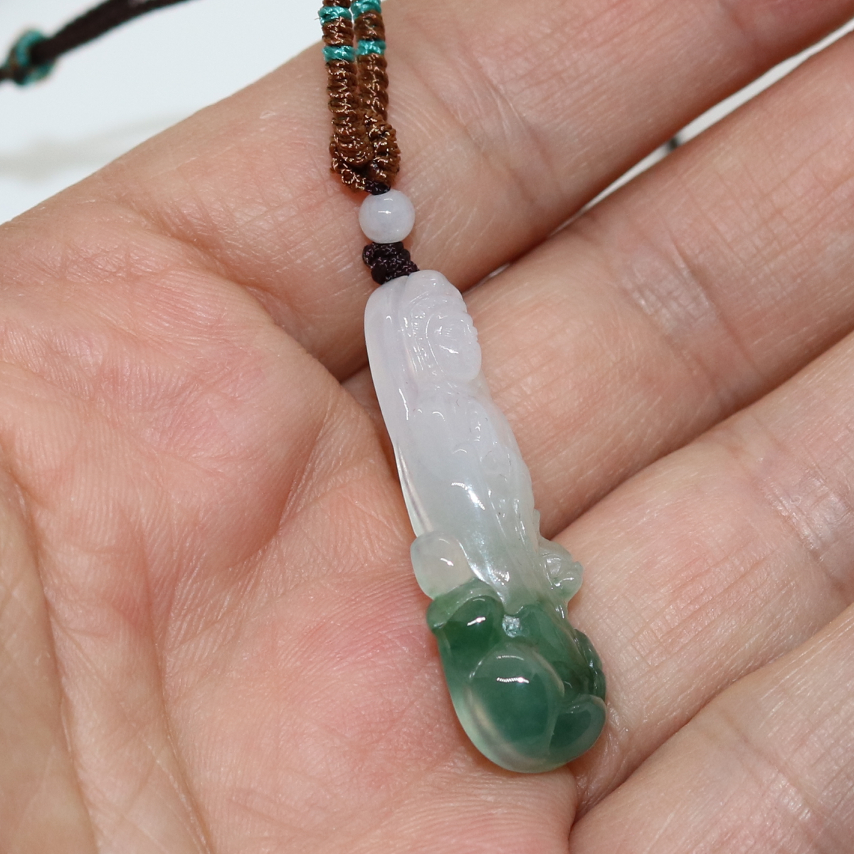 翡翠石の色を生かし、観音菩薩さまが本当の蓮の上に立っているように彫刻しております。