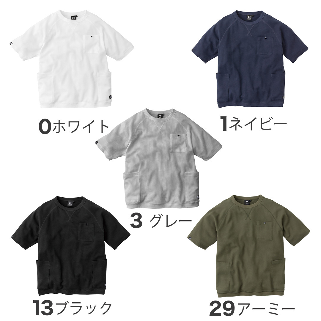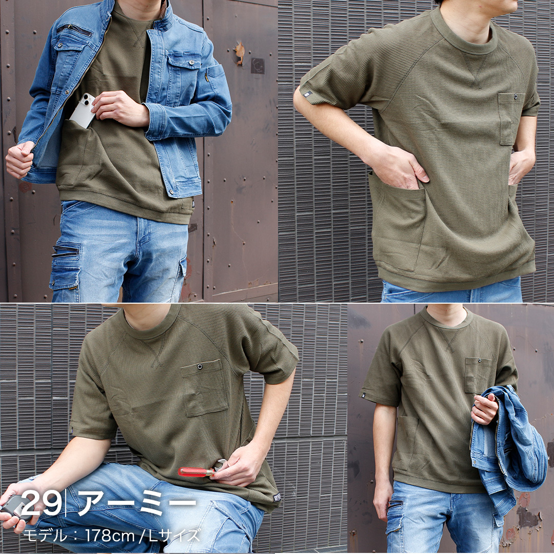 ワッフル生地の点接触でサラサラ触感の5ポケットTシャツ。