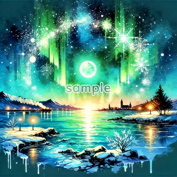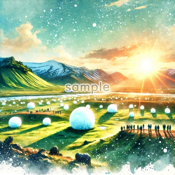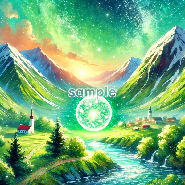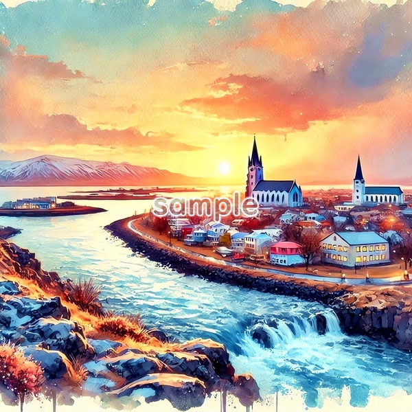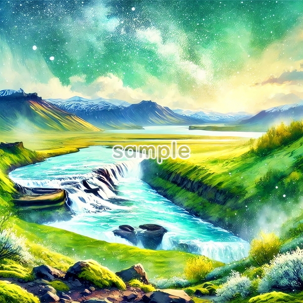 | アイスランド 世界国景色 緑と夕日と光 水彩 オリジナル絵イラスト 272P Iceland World country scenery green sunset light watercolor Original painting art picture image material |