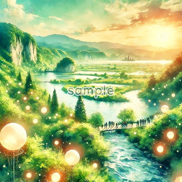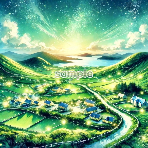 アイスランド 世界国景色 緑と夕日と光 水彩 オリジナル絵イラスト 272P Iceland World country scenery green sunset light watercolor Original painting art picture image material