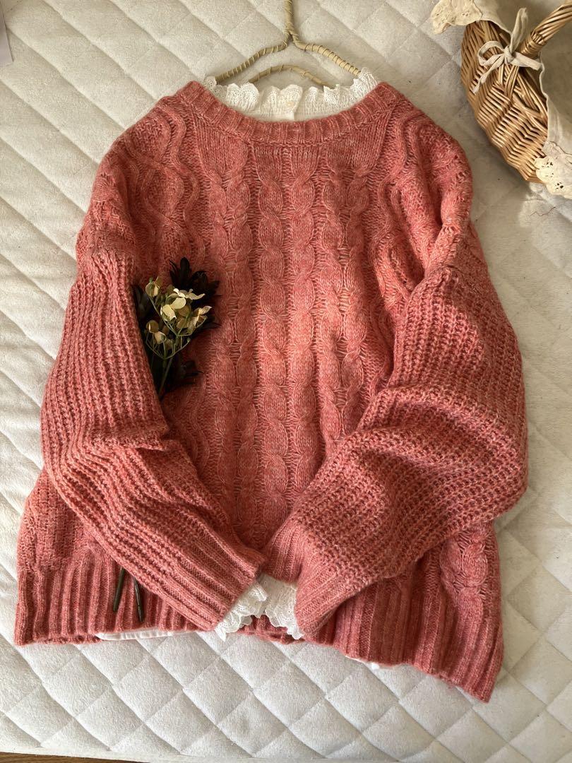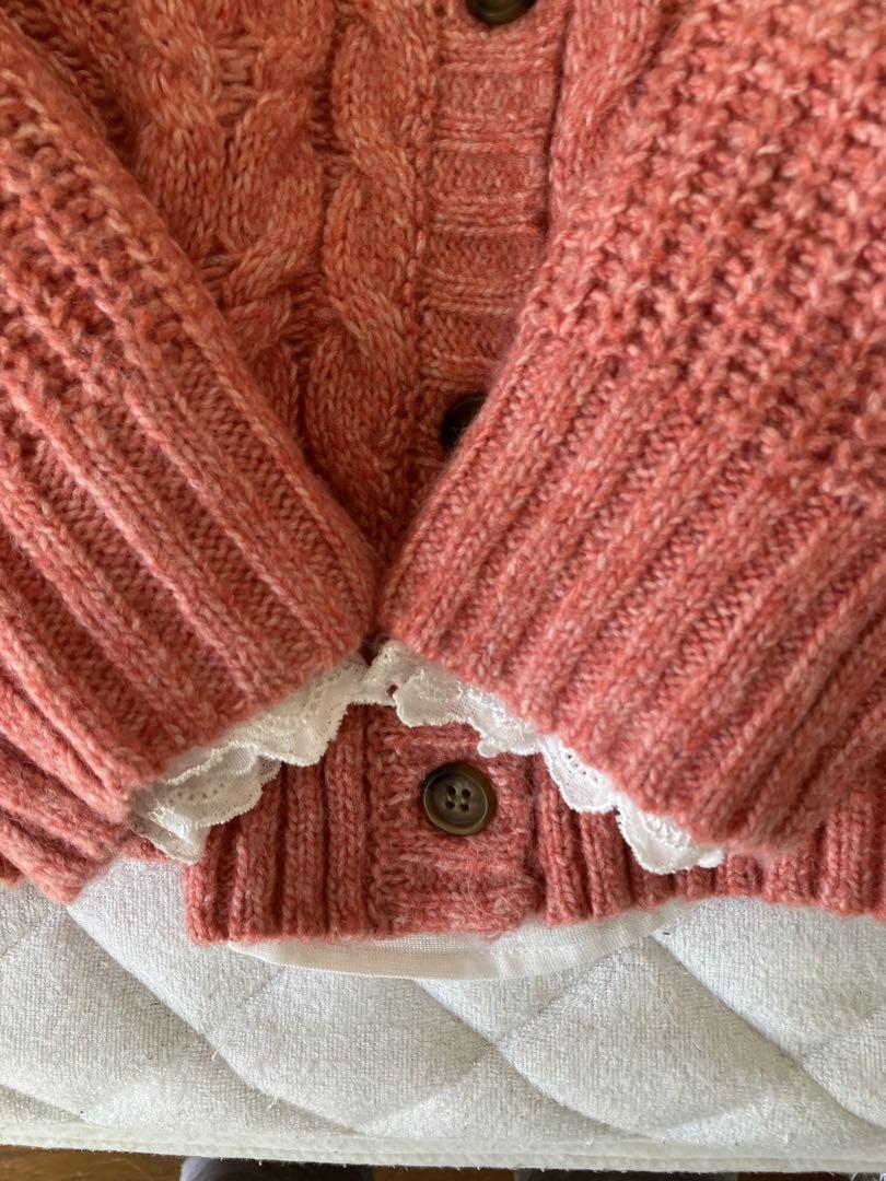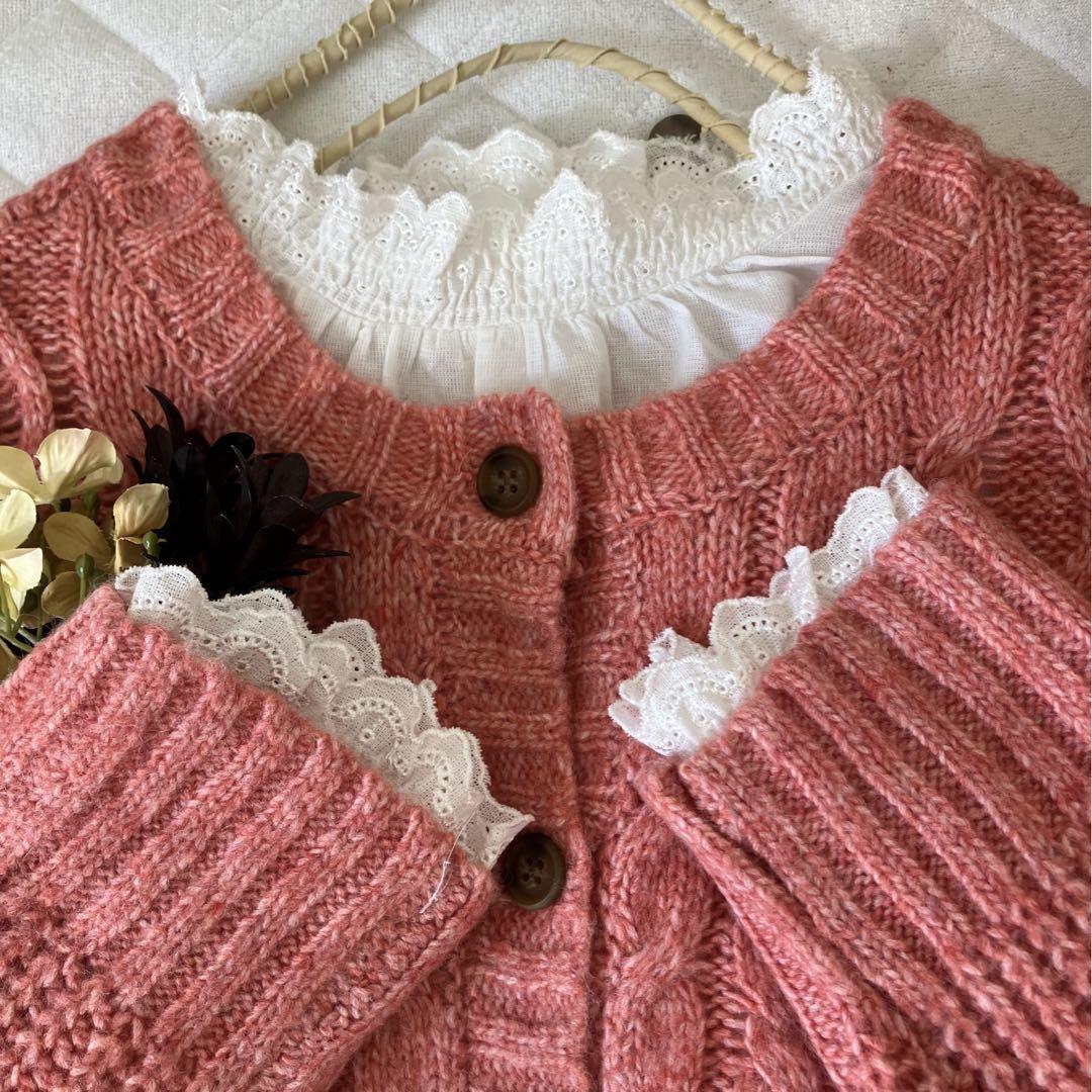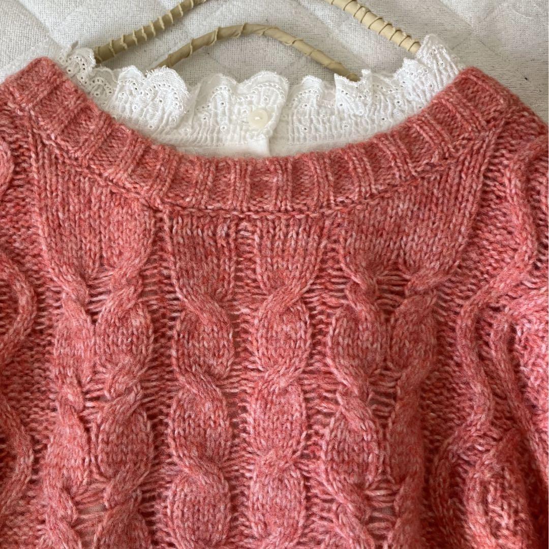 人気のケーブル編みの可愛らしいお色の暖かな前後着のニットです。