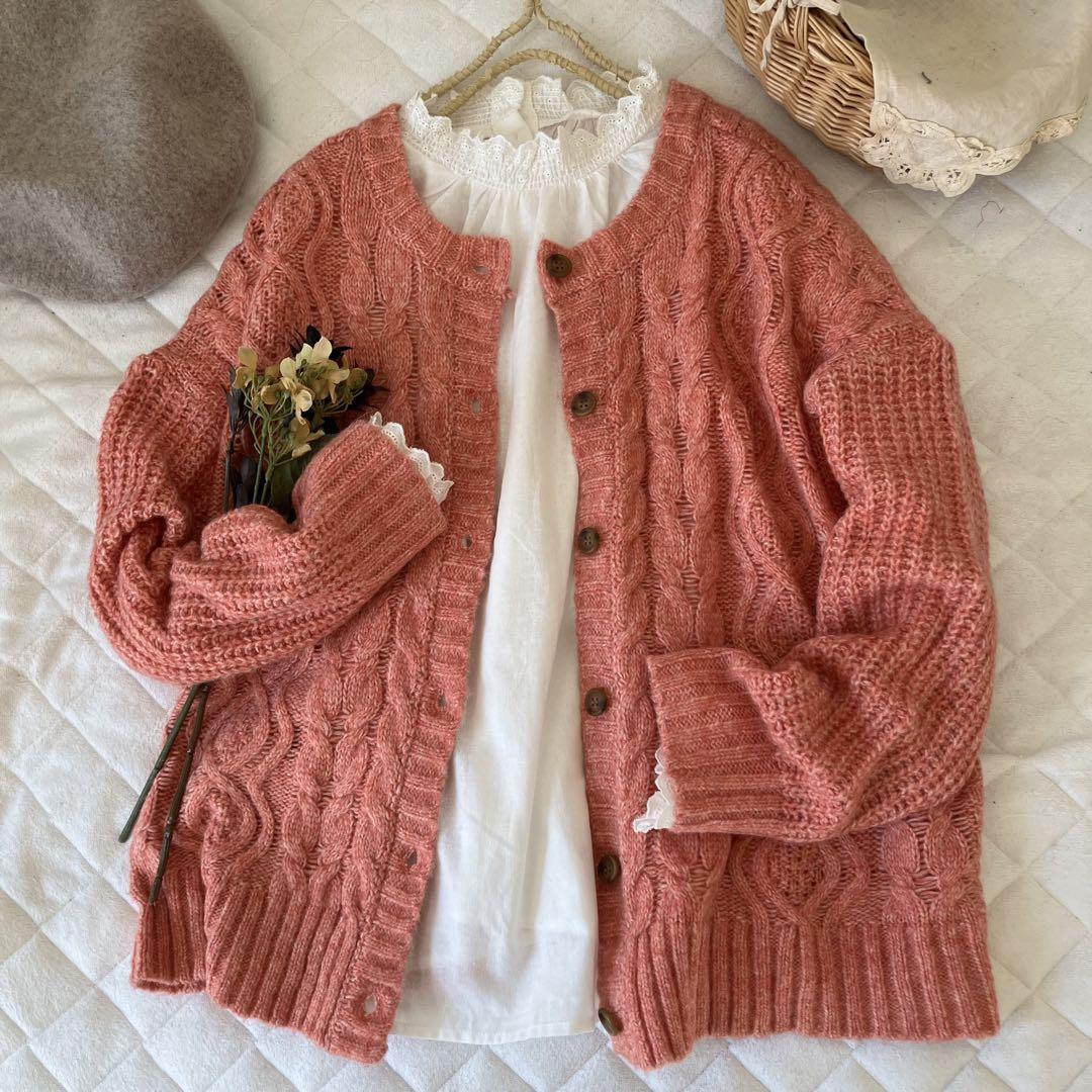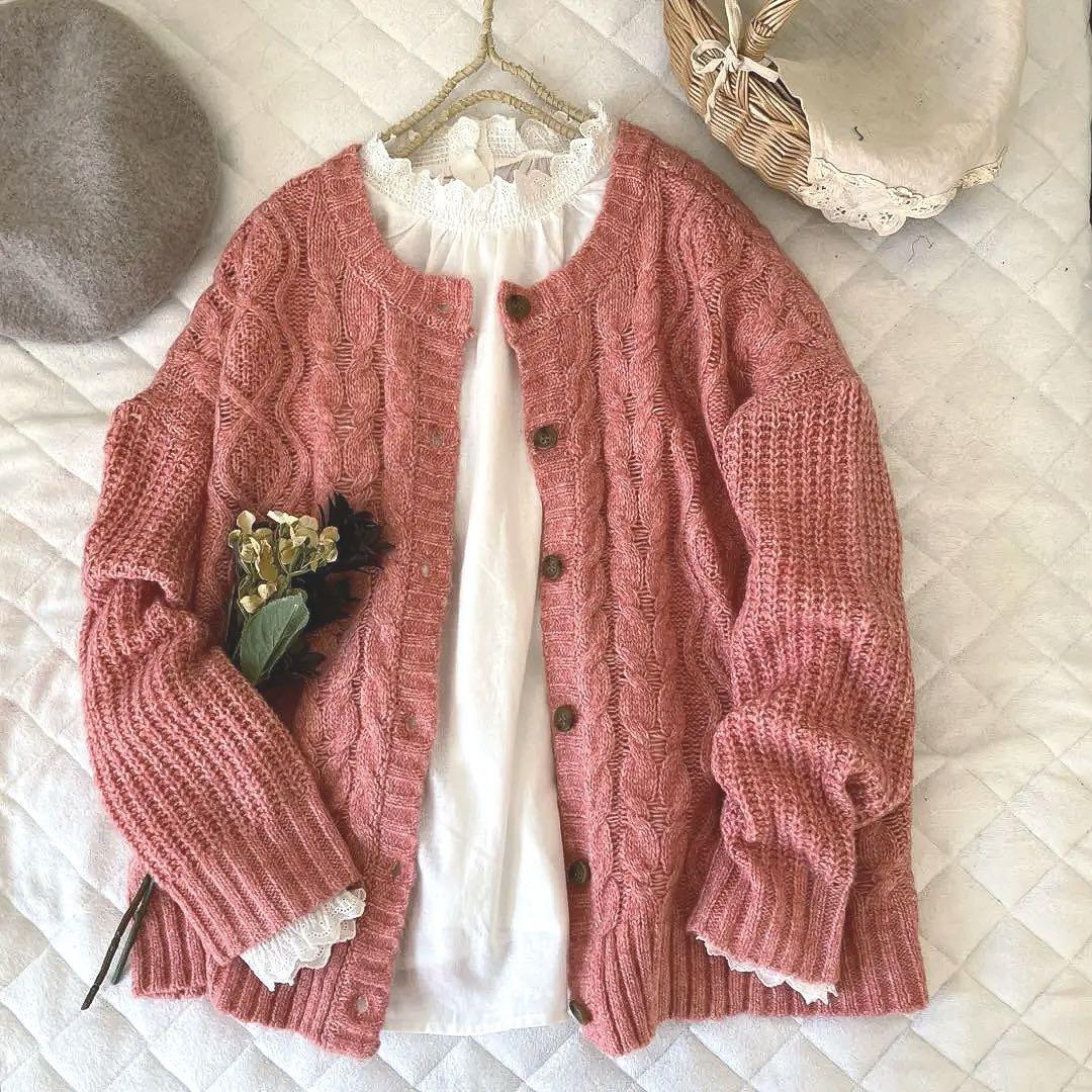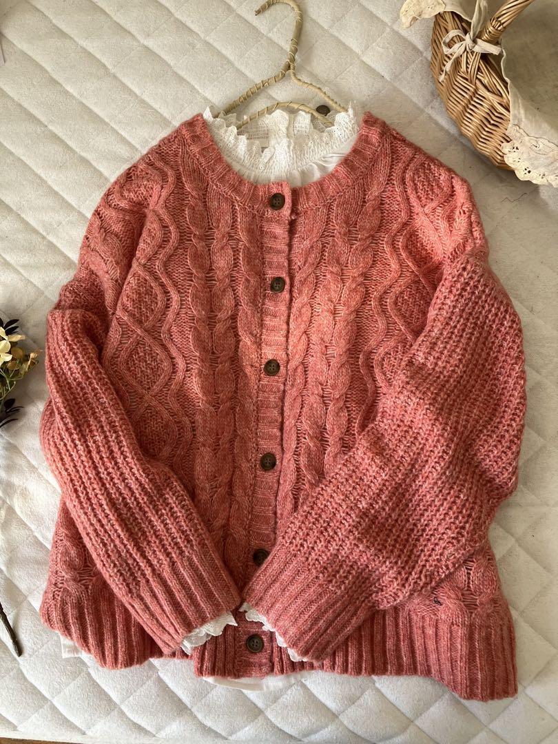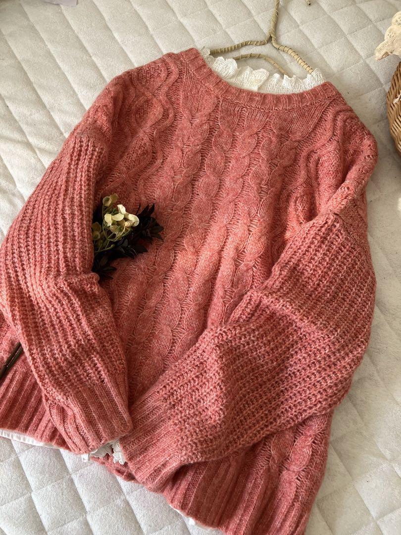 人気のケーブル編みの可愛らしいお色の暖かな前後着のニットです。