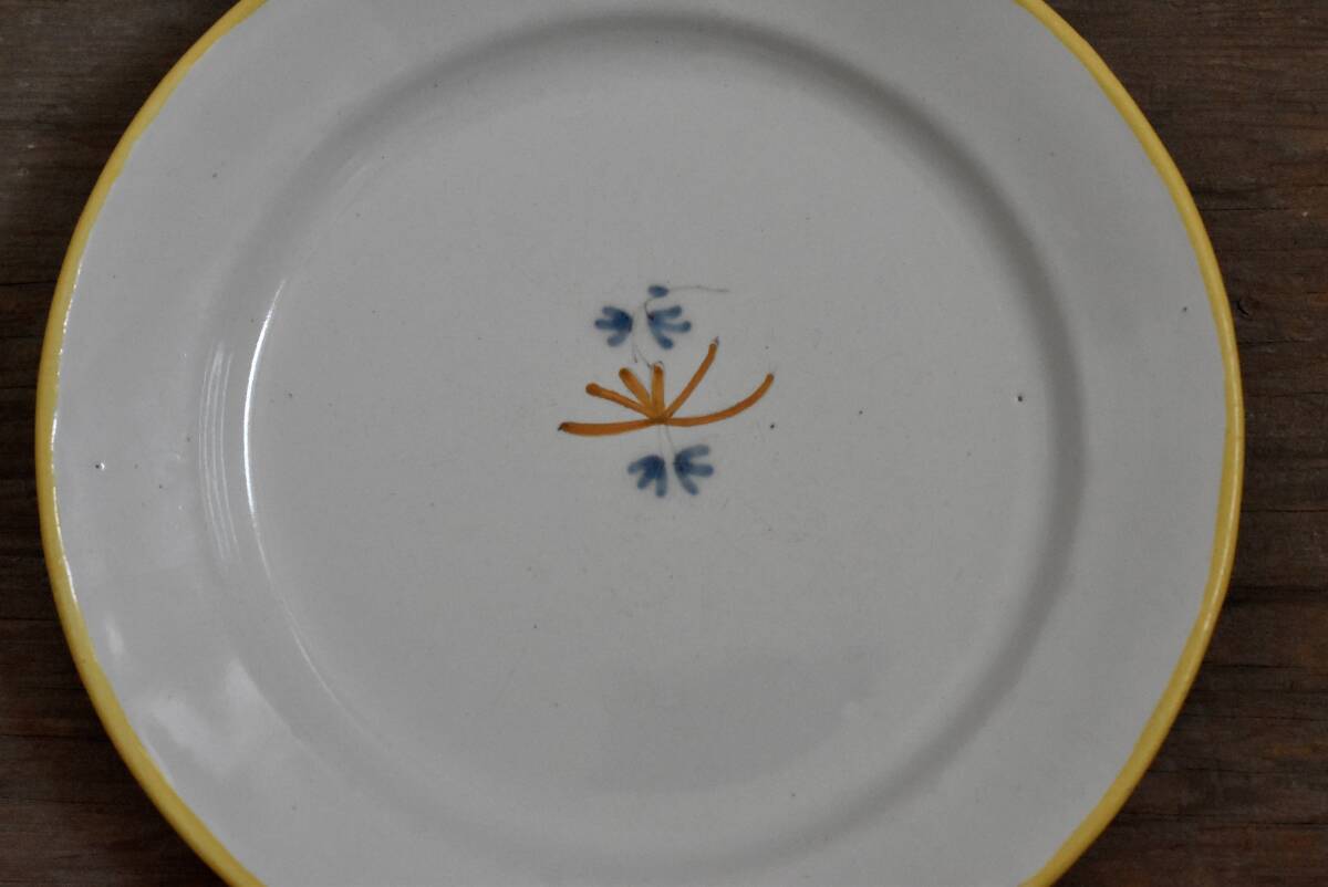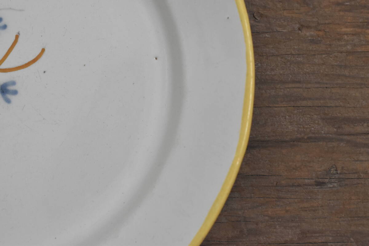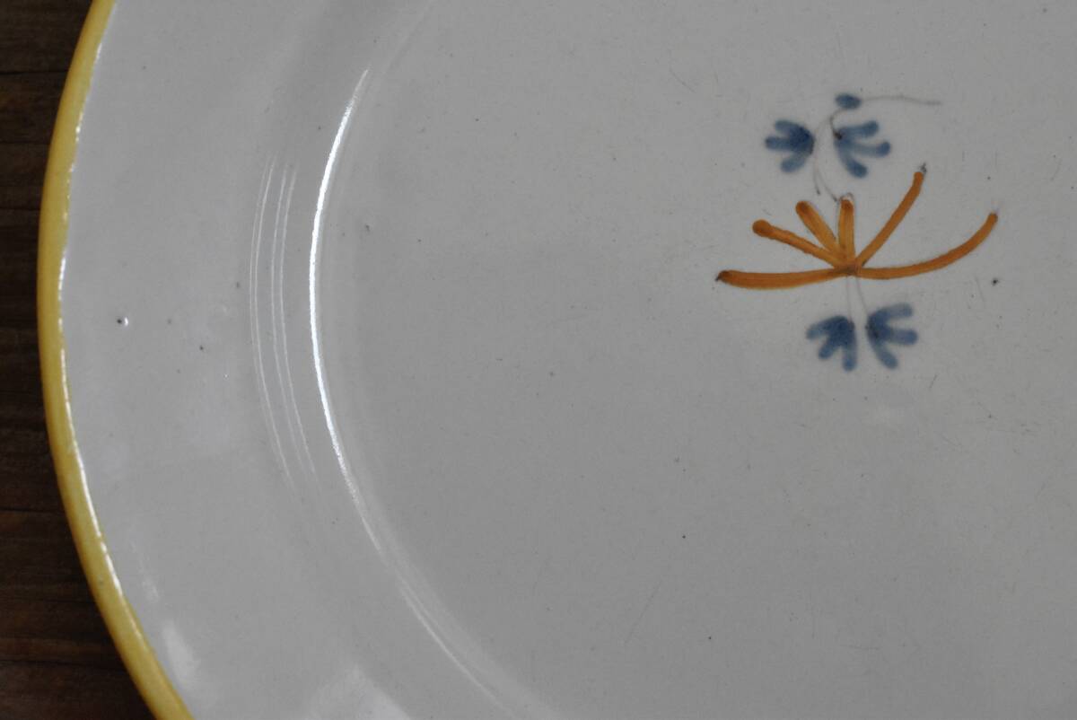 1700年代末のフランス、ファイアンスの絵皿です。黄色の縁に手描きの小さな花があしらわれています。