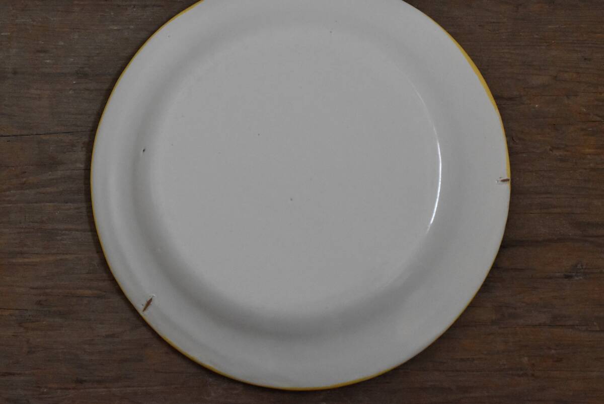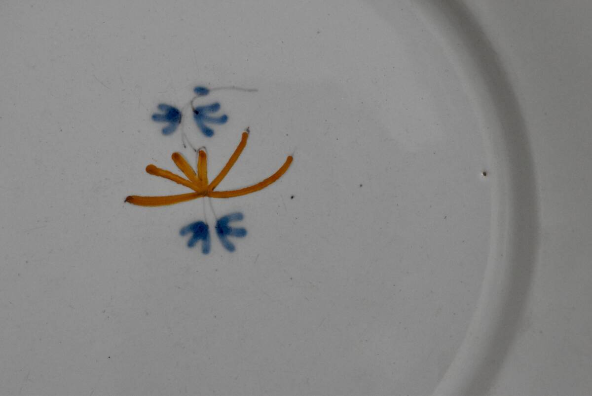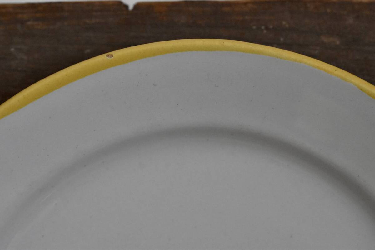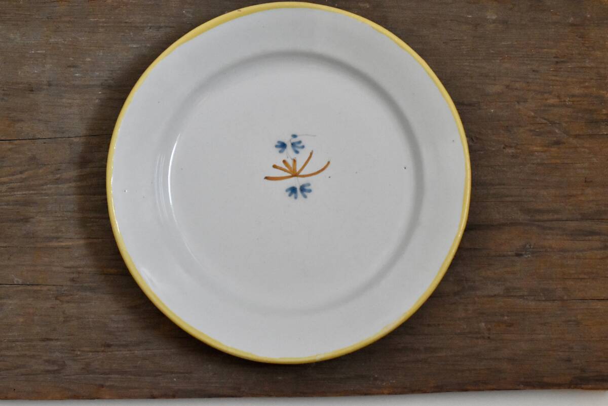 1700年代末のフランス、ファイアンスの絵皿です。黄色の縁に手描きの小さな花があしらわれています。