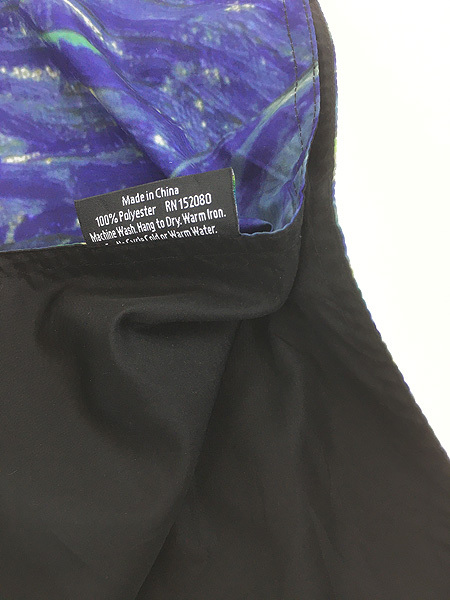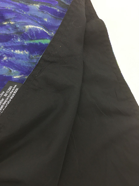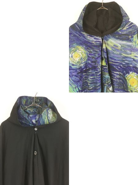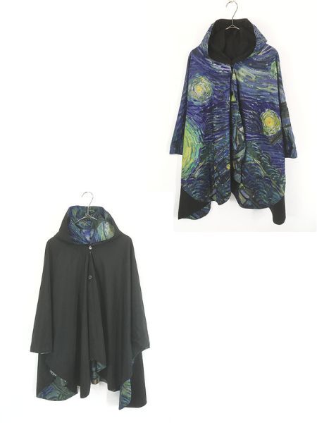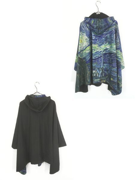 ウィンドブレーカーとケープの2つの機能に加え、軽量なレインポンチョはアートプリントされた総柄×無地のブラックカラーとリバーシブル仕様。隠された両面マグネットが「スリーブ」を形成し、風が強くても膨らむことがなくなります。※汚れ・キズ