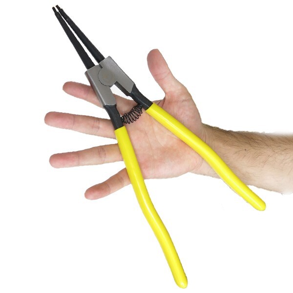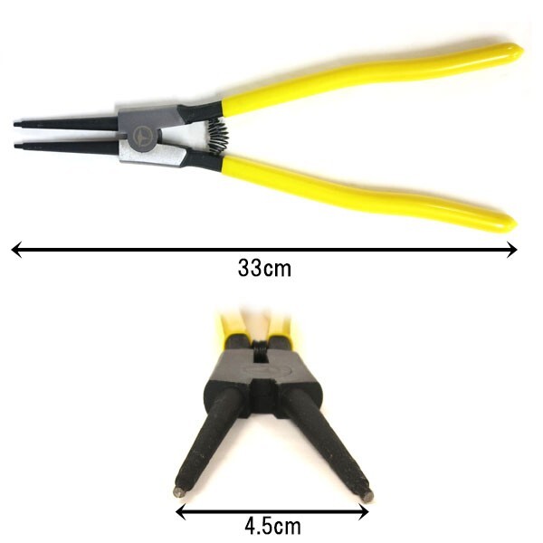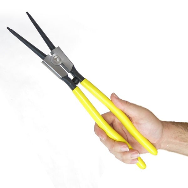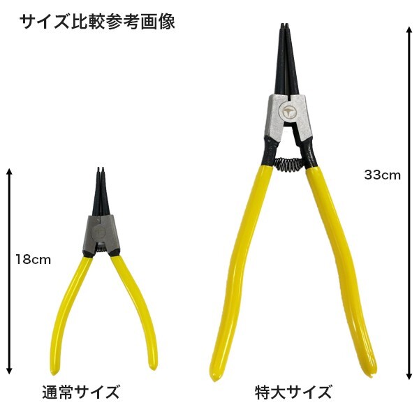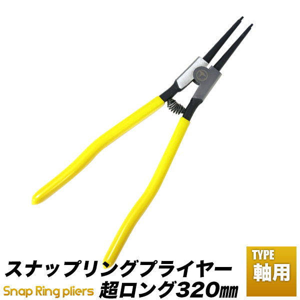 | 【 送料無料 】 特大ロングサイズ スナップリングプライヤー 【 軸用 】 先端0度 (ストレート形状) グリップ : 黄色 全長 約320mm | |