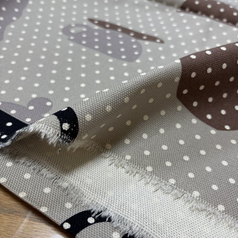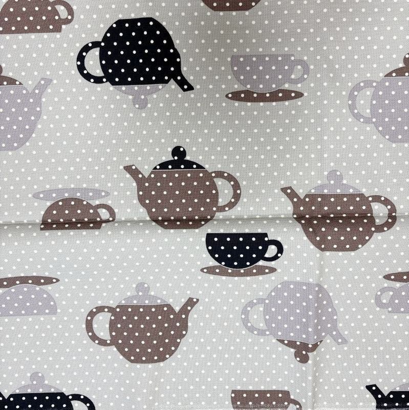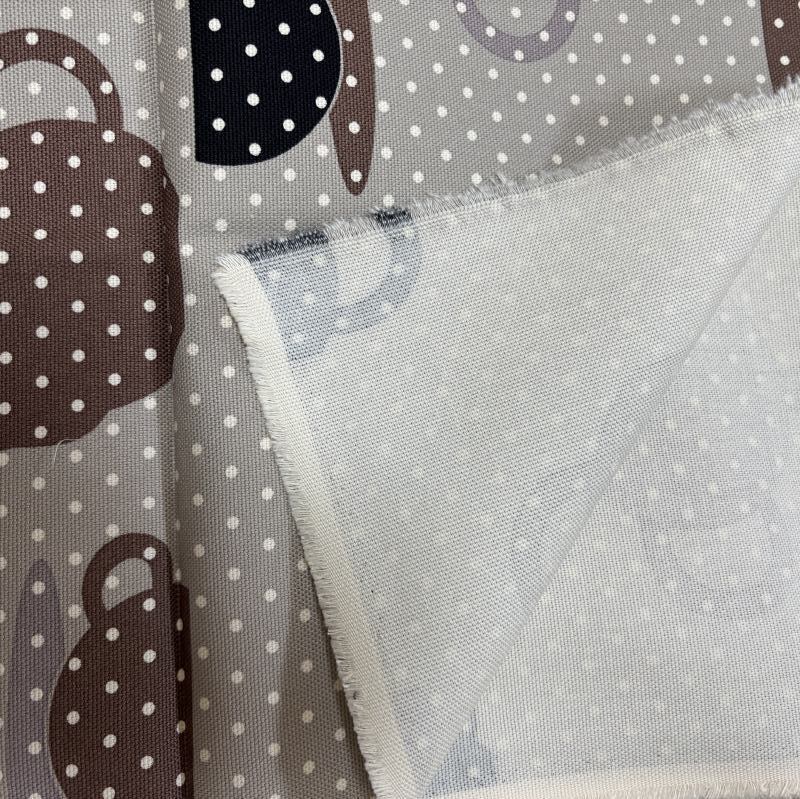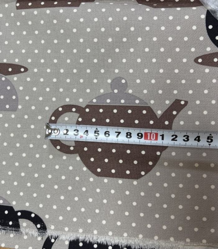 北欧風デザインで、グレー地にコーヒーカップ&ティーポット柄とドット柄を