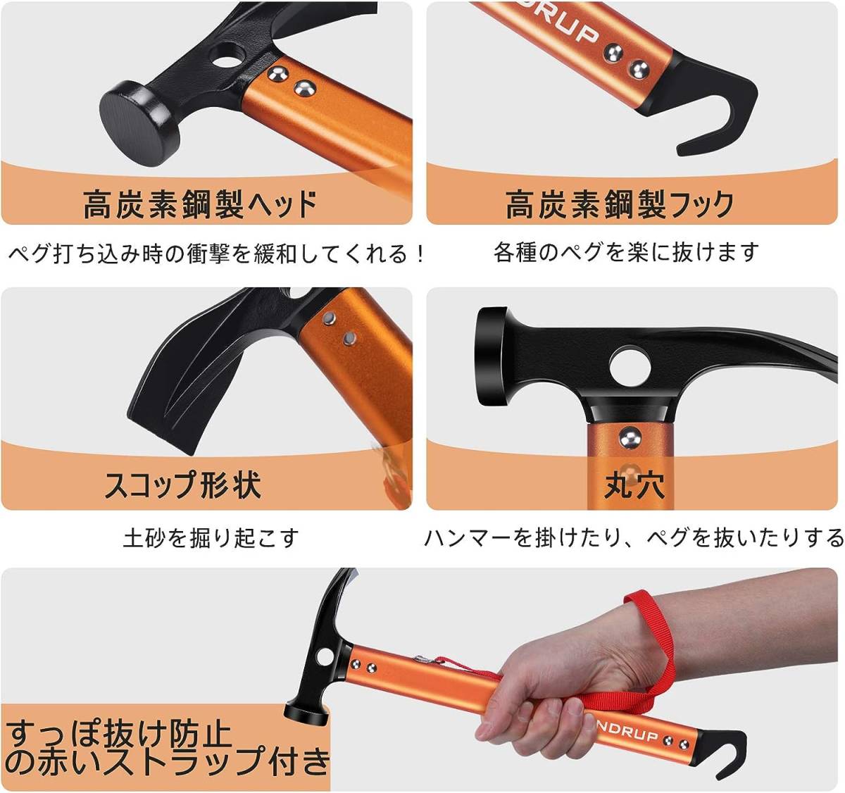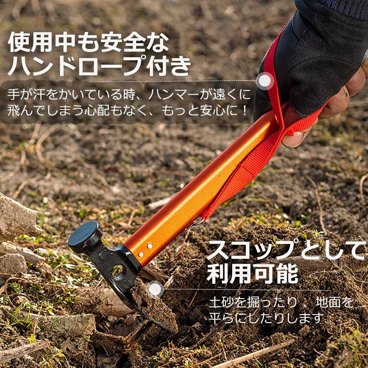 • 【3in1 多機能ハンマー】:ペグ打ち、各種ペグの抜き、土掘りがこれ1本でこなします!①ヘッド部分が簡単にペグをしっかり打ち込めます;②ヘッド片側はスコップとして使え、土壌や砂などを掘り起こすことができます;③丸穴部分がハンマーを掛けるだけでなく、ペグを真上に引き抜くのもできます;④下のフック部分はソリッドステークも引っ掛けて簡単に抜くこともできます。