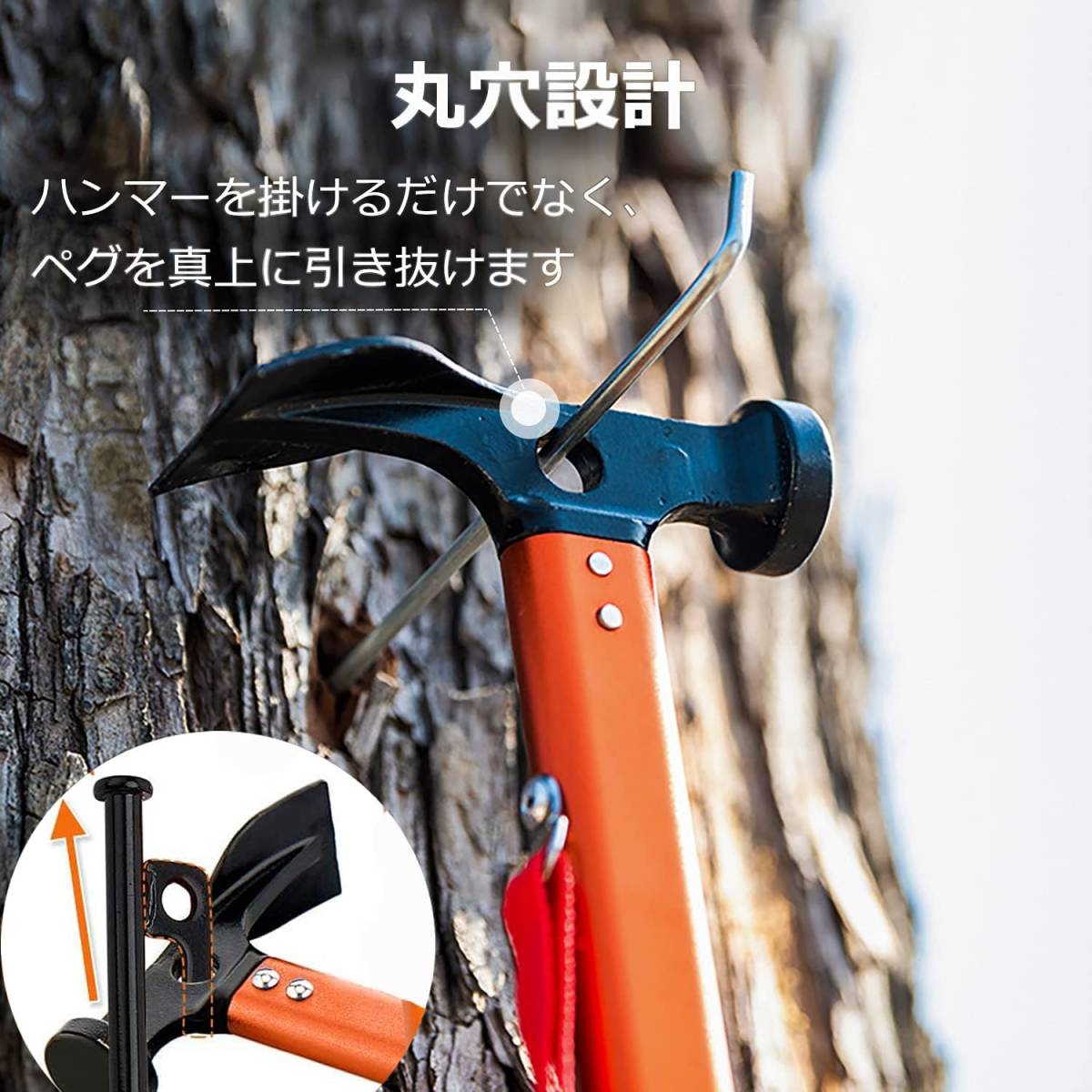 • 【安定性のアップ・品質へのこだわり】:従来のお客様から「力を入れてペグを抜く時、フックが落ちやすい」という意見を考慮します。真新しい金型を採用し、ハンマーの底部に固定用のリベットをもう1本追加し、ハンマー柄と尾部の接合部がしっかり固定されます。外れることがなく、全力を入れてペグを抜くことを実現できます。