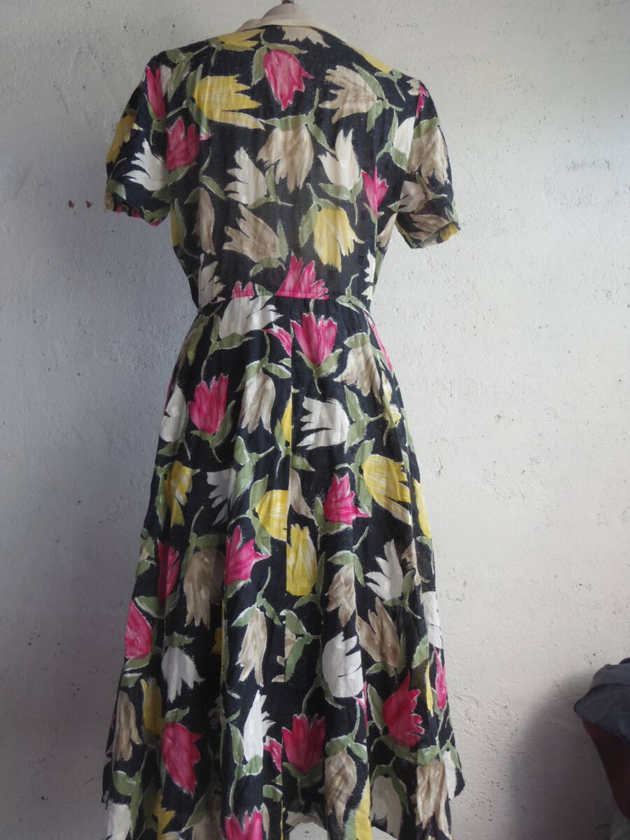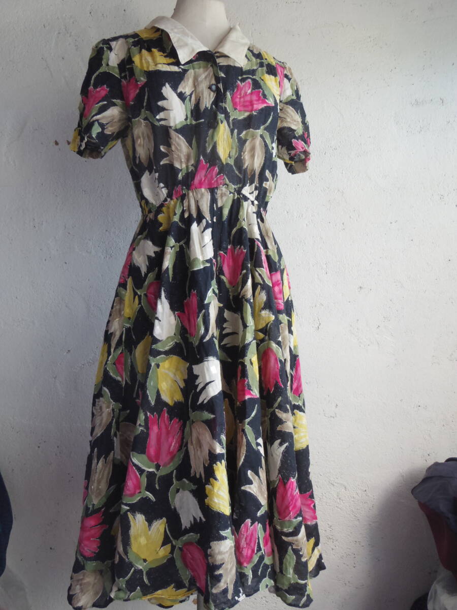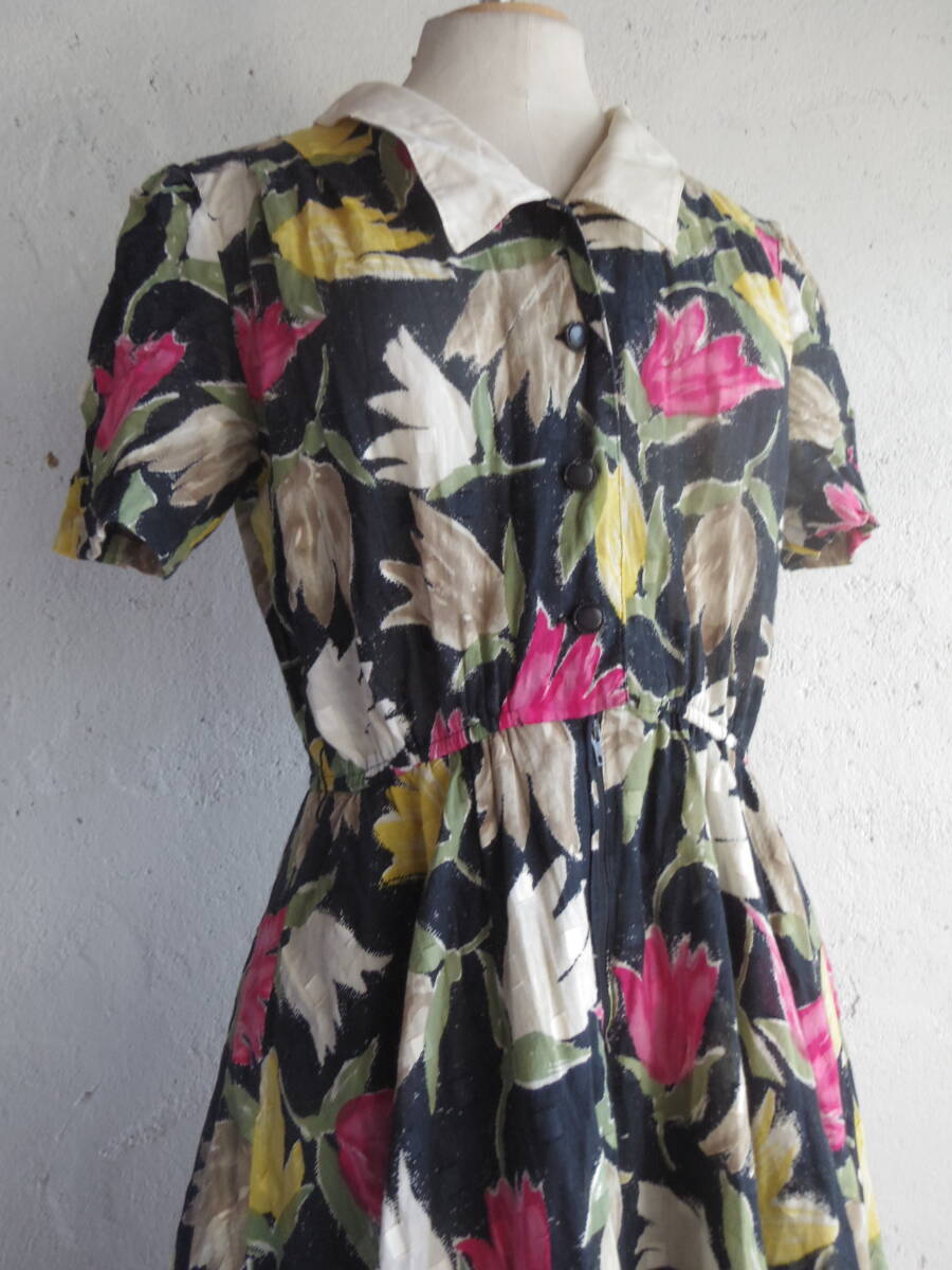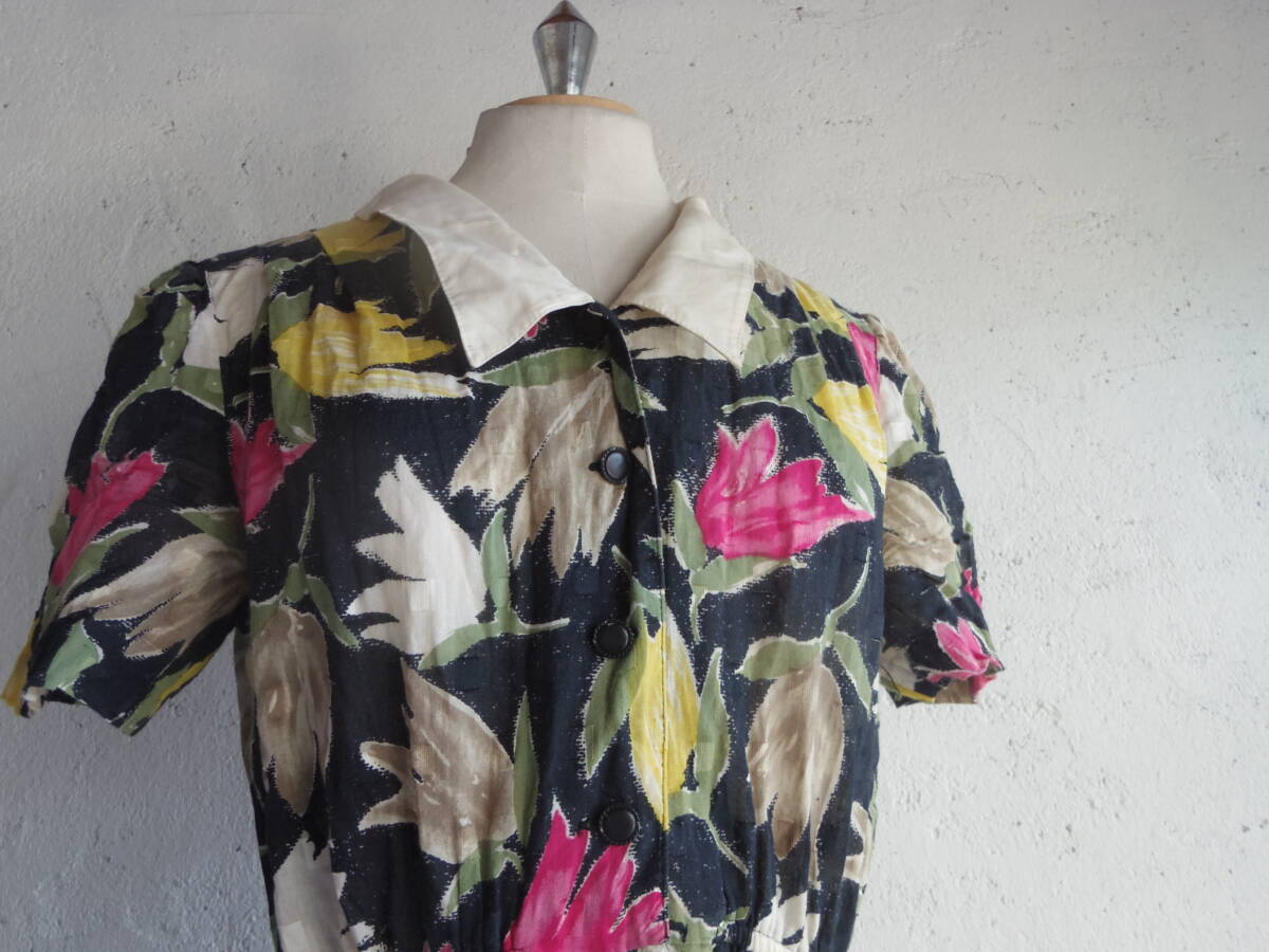 +--- 古着♪レトロVintage花柄チューリップクラシカルおしゃれモダン夏ワンピ♪ ---+
