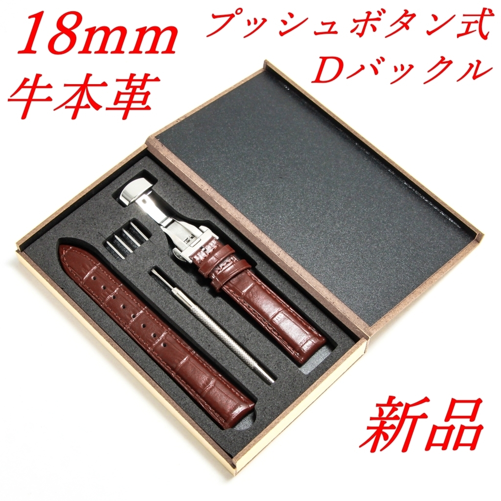 腕時計ベルト プッシュボタン開閉式Dバックル仕様 茶色18mm 木箱入り ばね棒 ばね棒外し付属 新品
