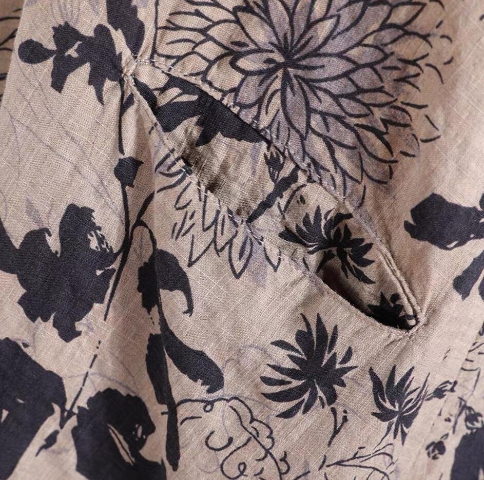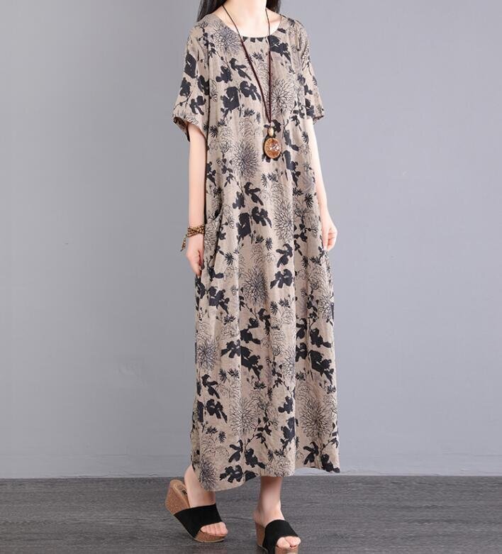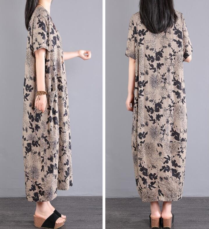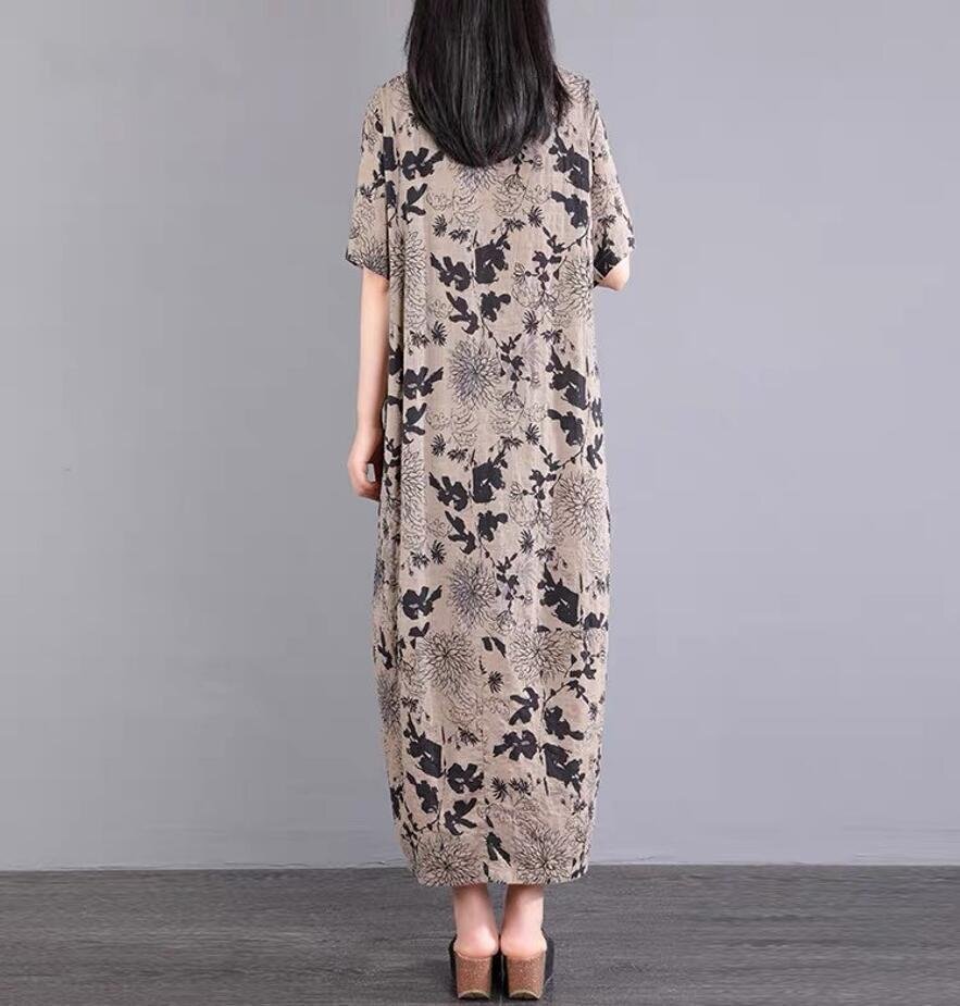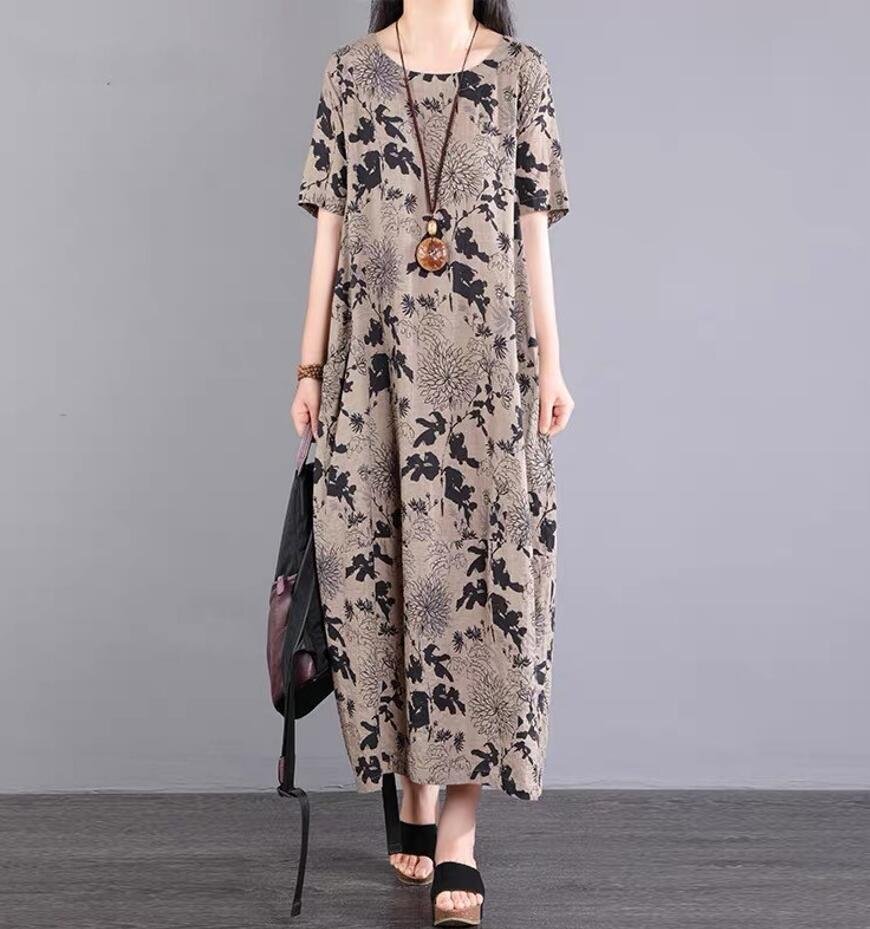 夏新品 ワンピース 半袖 レディース 綿麻混 ロングワンピース プリント柄 可愛い ゆったり 大きいサイズ ★XLサイズ