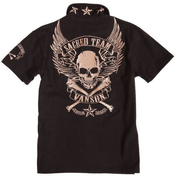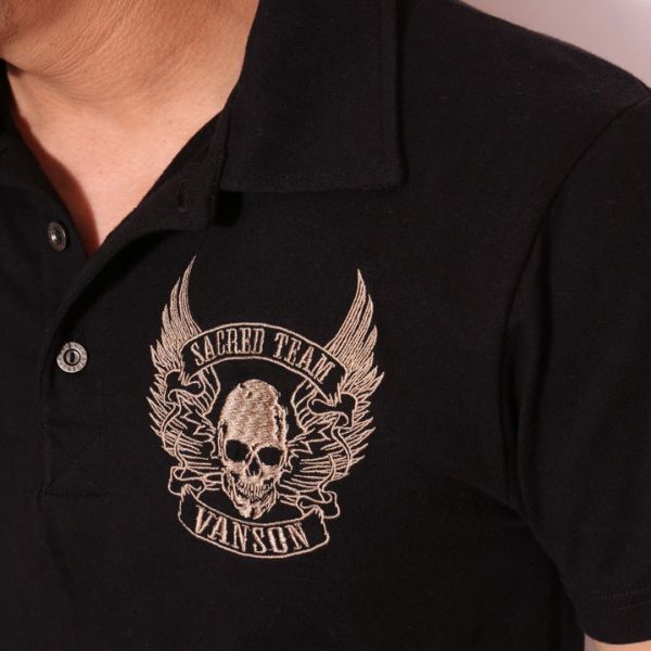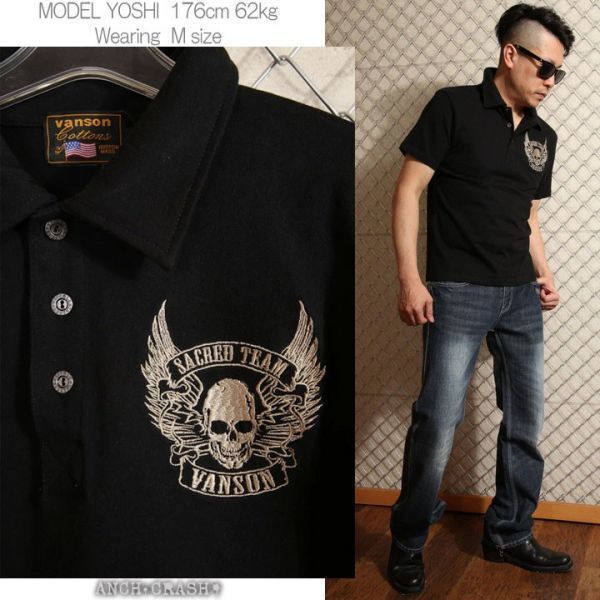 当店別注 バンソン VANSON 刺繍 半袖 ポロシャツ ブラックA(ライトチャコール刺繍)【XXLサイズ】NVPS-303 アメカジ バイカー ドクロ スカル