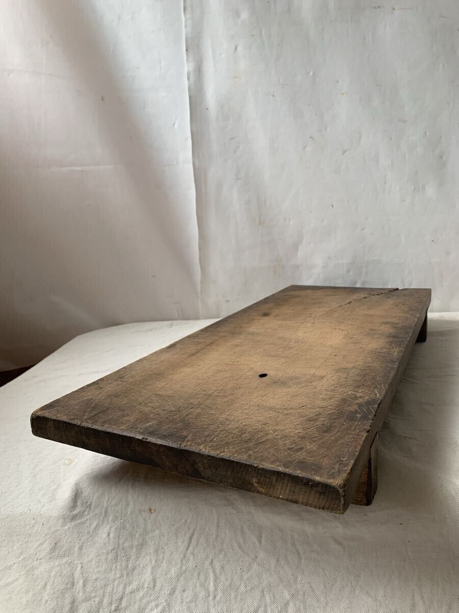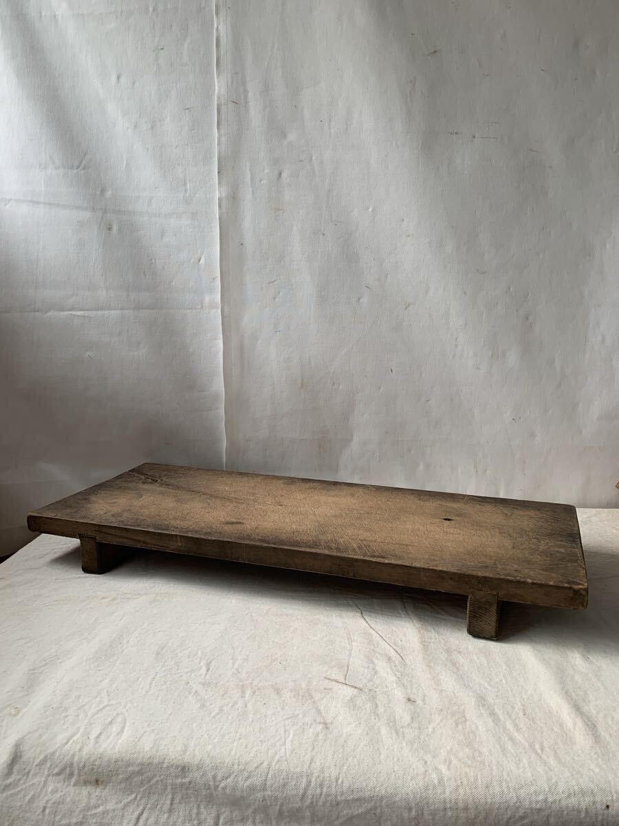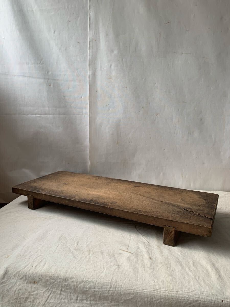 天板厚み約2.4cm 経年の雰囲気が素敵な無垢材の脚付一枚板です。壁などに飾ったり、花台や展示台としてお店やイベント出店時の什器として使って頂いても素敵だと思います。脚を外して一枚板として使っても良いかと思われます。