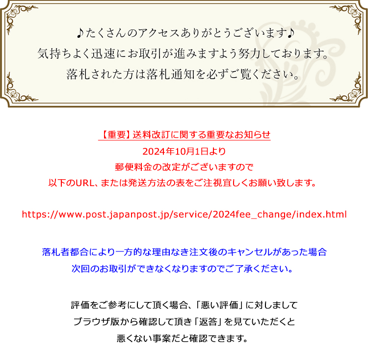 Ⅲ.一旦成功中标,您必须全额支付该拍品(成交价+消费税+银行转账费+日本邮费+代购费)。