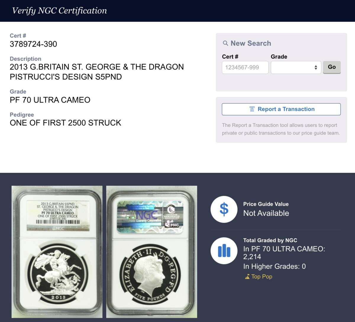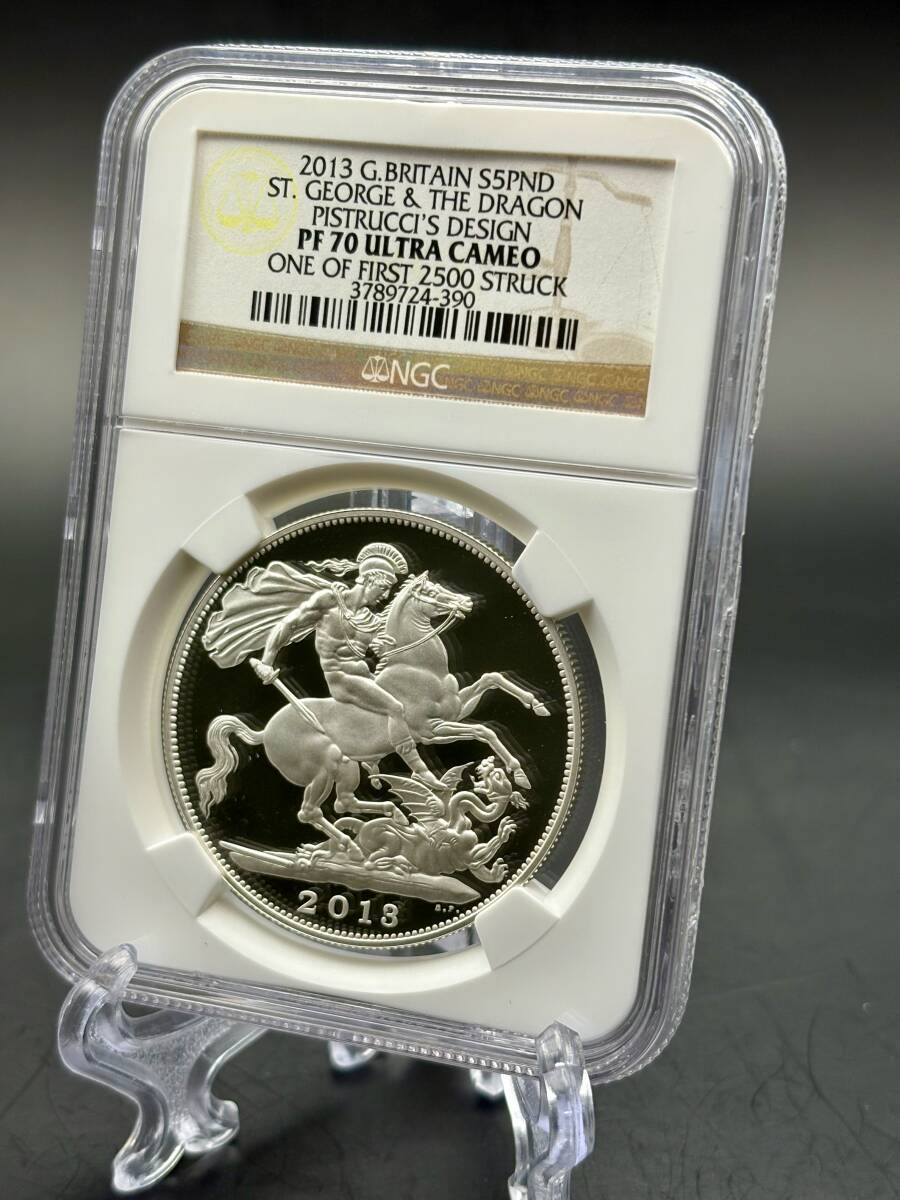 ★最高鑑定 2013 イギリス ジョージ王子 5ポンド 銀貨 NGC PF70 ULTRA CAMEO 竜退治 ピストルッチ 初期発行2500枚 英国 モダンコイン