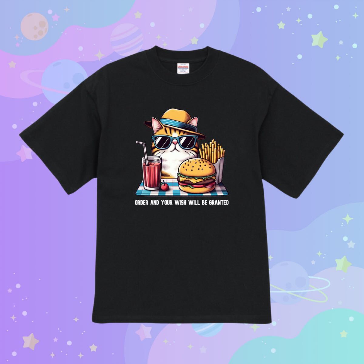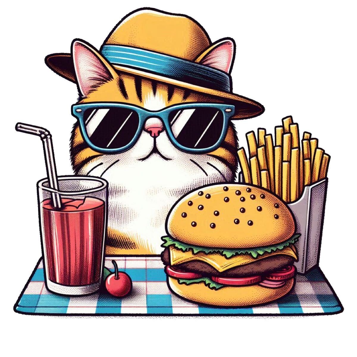 サングラスをかけたおちゃめな猫が、ハンバーガーやポテト、ドリンクと一緒に描かれた、遊び心たっぷりのイラスト。