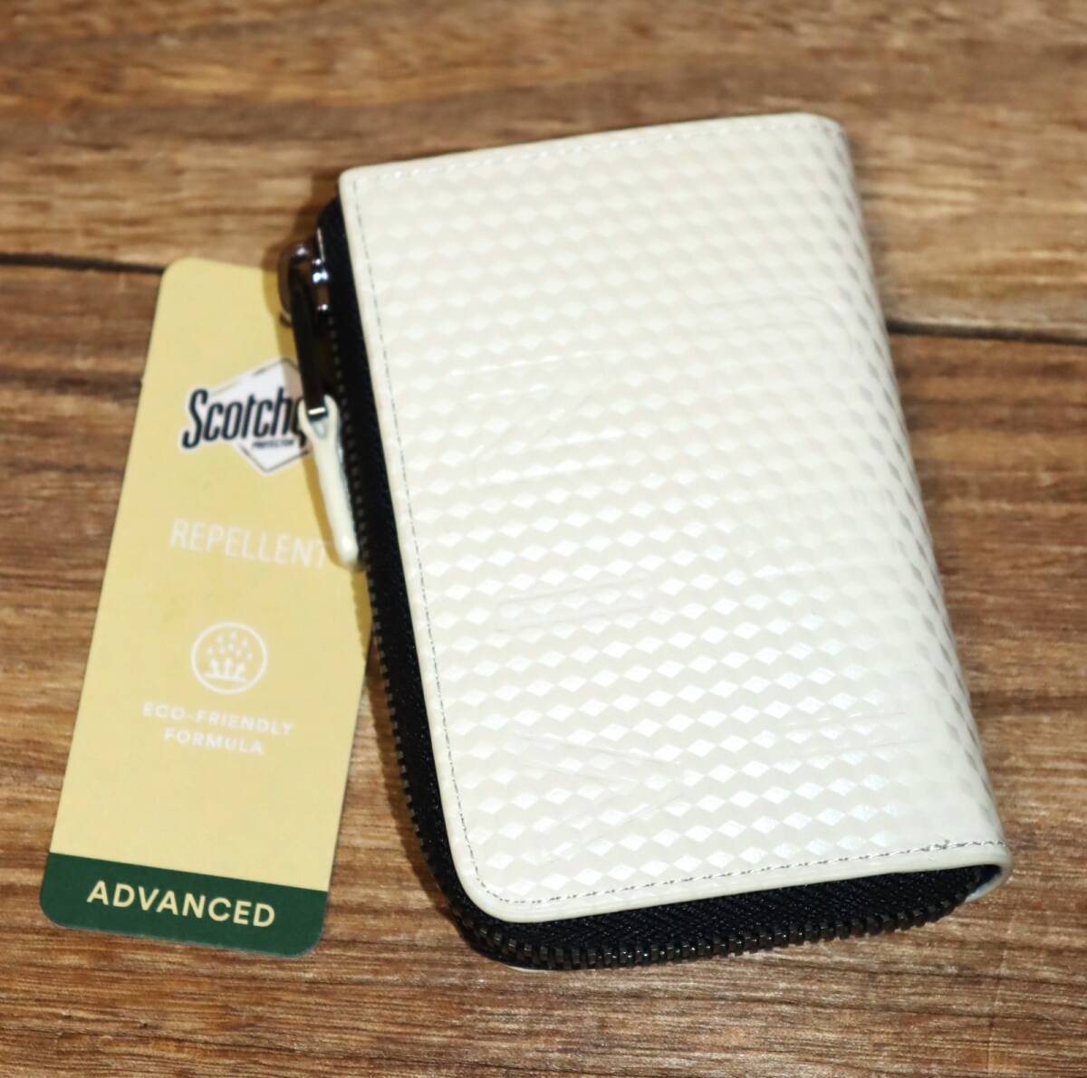 立体的なダイヤ柄のエンボス加工と撥水加工を施した牛革に、ランバンオンブルーのブランドロゴをエンボス加工で表現した