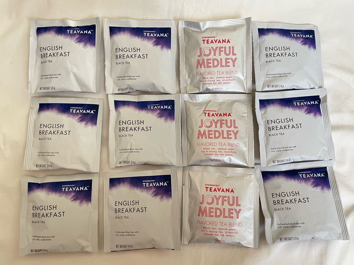 スターバックスの紅茶、TEAVANAのジョイフルメドレー4袋、イングリッシュブレックファースト8袋、計12袋です。