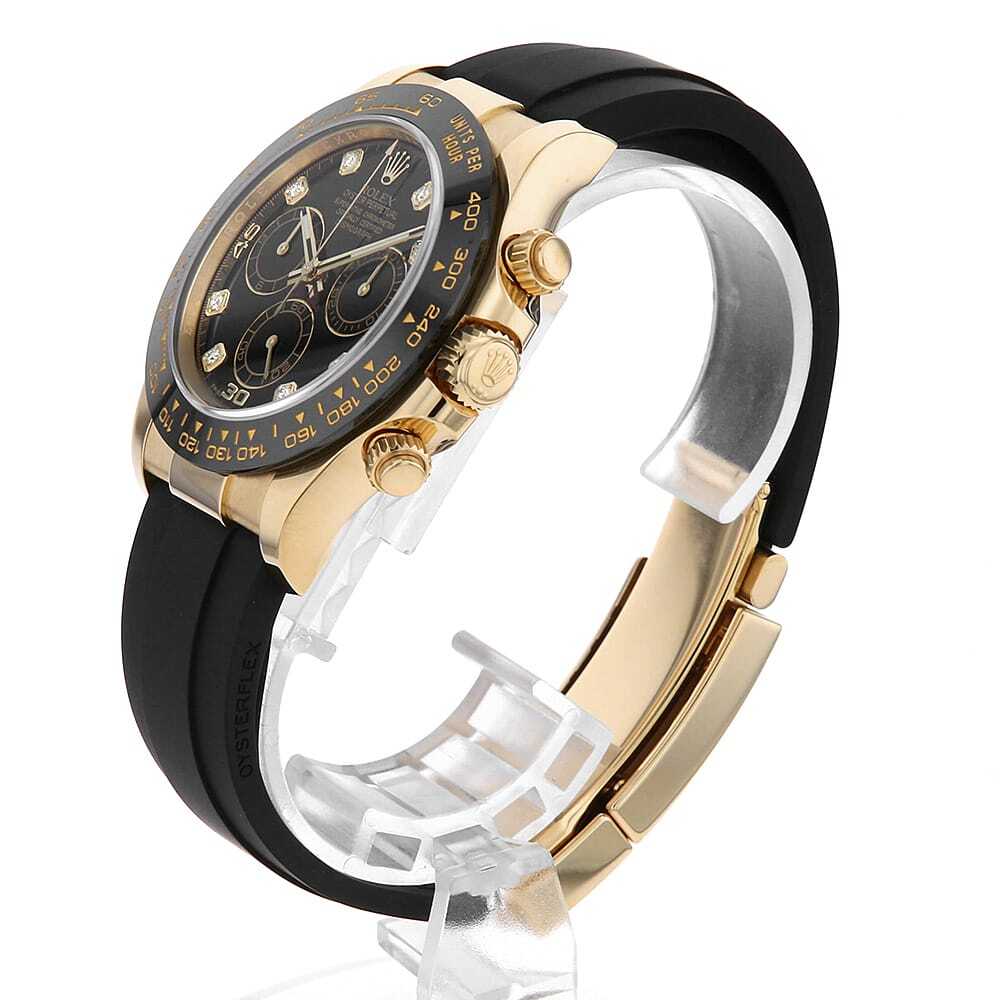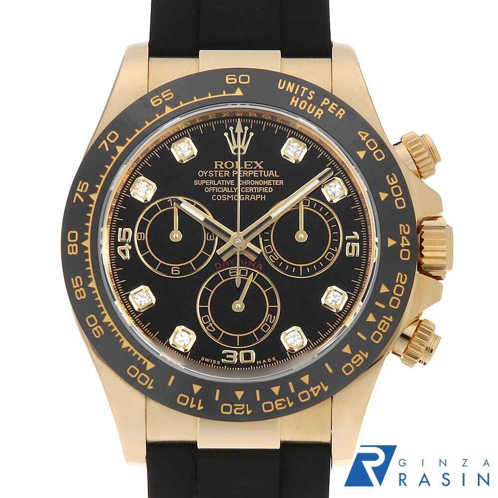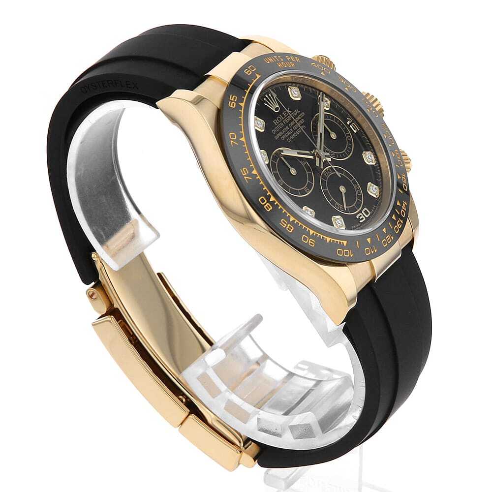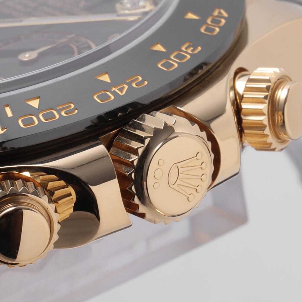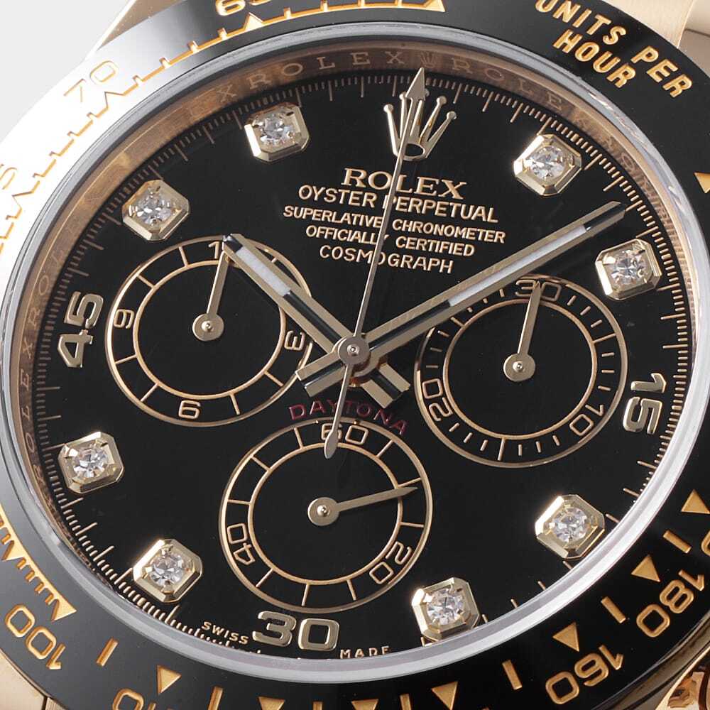 | モデル情報 | 言わずもがなのロレックス・スポーツモデルの最上位機種であり最人気機種のコスモグラフ・デイトナ。18金イエローゴールド製のケースに、モノブロック(一体構造)のブラックセラクロムベゼルを採用。上質なセラミックを使用することで耐蝕性、耐傷性に優れ、色褪せを防ぐことに成功しています。また、ベゼルの目盛りにゴールドの微粒子層を蒸着し、PVD加工することで高い視認性をも実現しています。こちらは、インデックスに8Pダイヤをセッティングした高級感あるデザインです。特別な一本をお探しの方におすすめしたいモデルです。 |