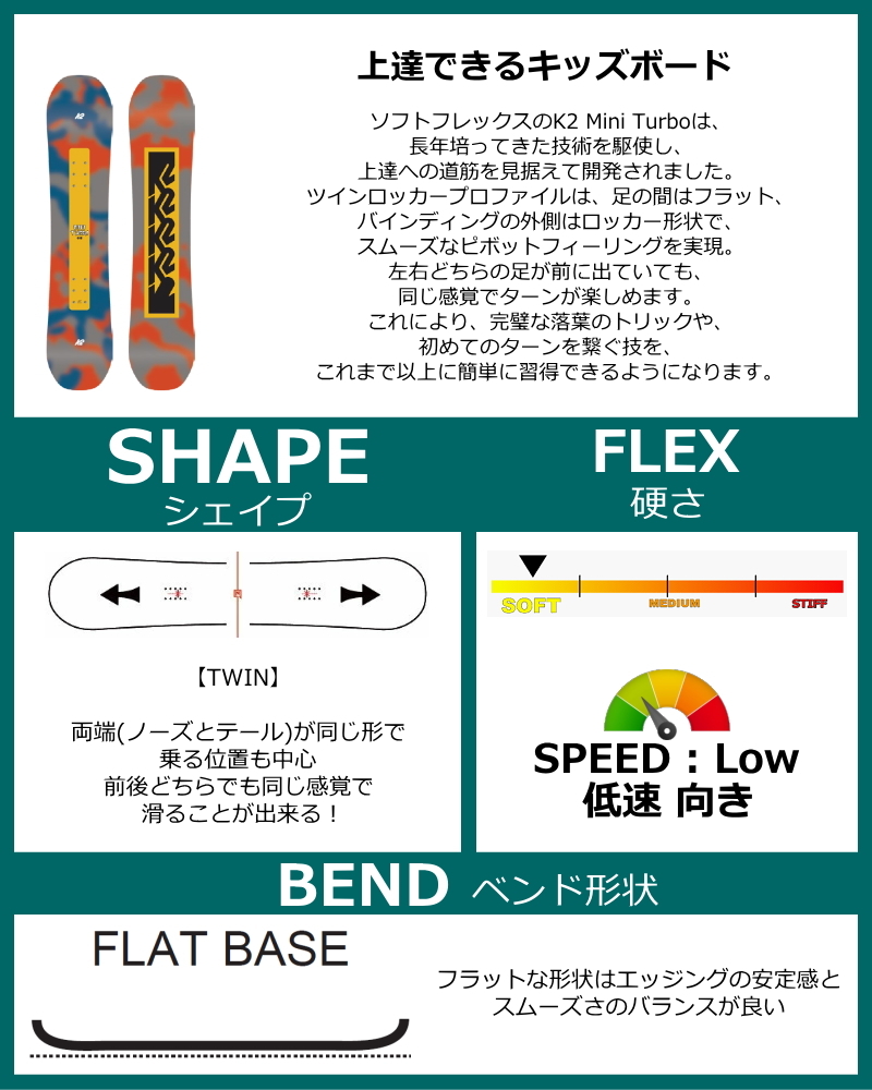 ソフトフレックスのK2 Mini Turboは、長年培ってきた技術を駆使し、上達への道筋を見据えて開発されました。ツインロッカープロファイルは、足の間はフラット、バインディングの外側はロッカー形状で、スムーズなピボットフィーリングを実現。左右どちらの足が前に出ていても、同じ感覚でターンが楽しめます。これにより、完璧な落葉のトリックや、初めてのターンを繋ぐ技を、これまで以上に簡単に習得できるようになります。!