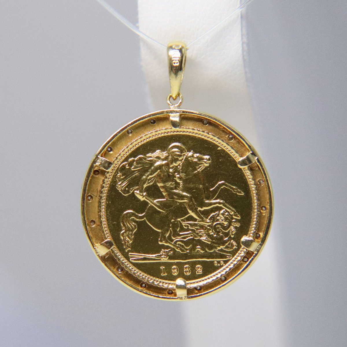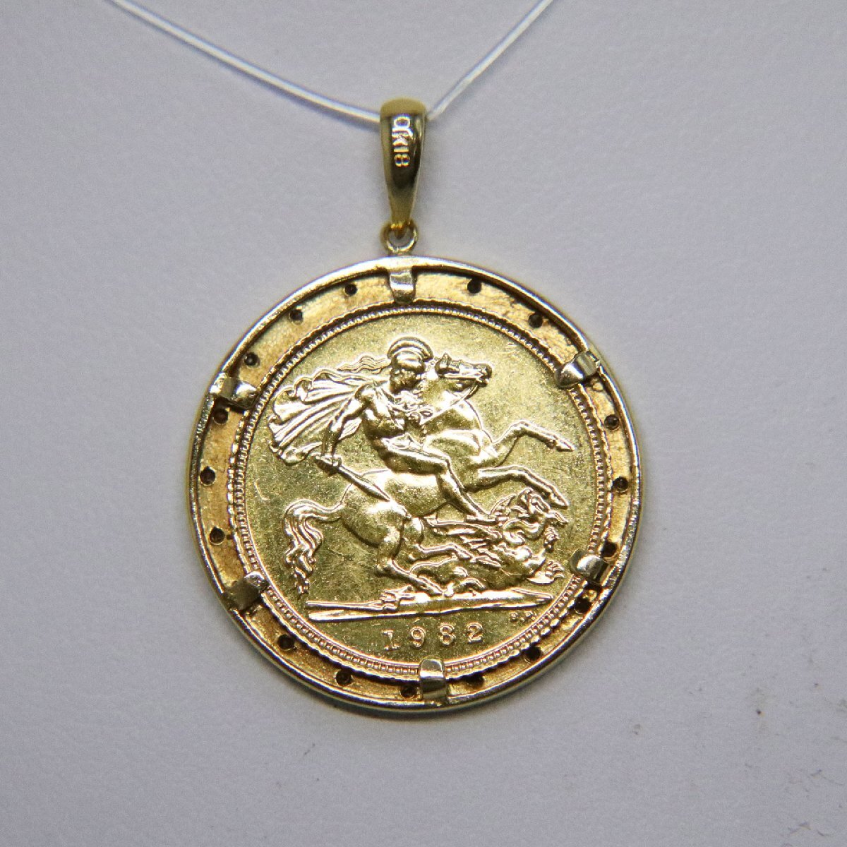 商品名 K18枠/K22 1982 ソブリン金貨 エリザベスII世 聖ジョージ 竜 馬 ペンダントトップ PH コイン 重量約6.6g pendant Sovereign 中古 送料無料!
