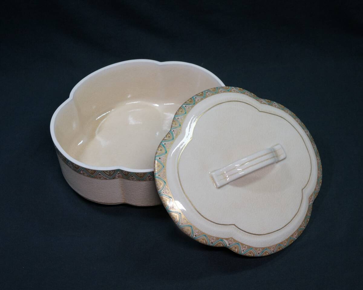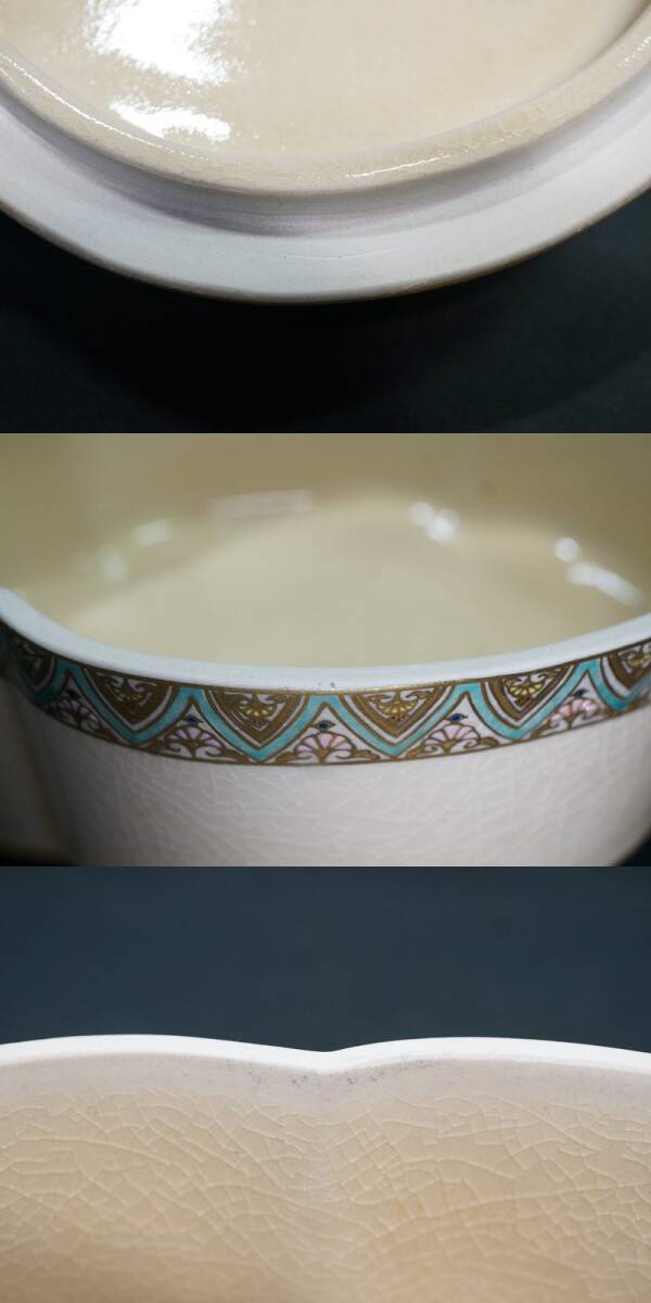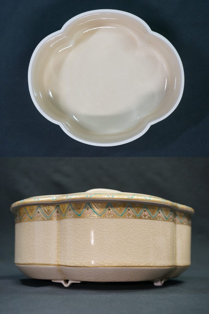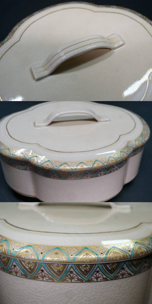 ■東ハ:【薩摩焼】窯元 橋本陶正山作 惺斎好 サツマ 木瓜形 食籠 喰籠 共箱付 堀内宗心書付箱 茶器 茶道具 さつま焼 ★送料無料★■ 薩摩焼 窯元 橋本陶正山作 「 惺斎好 サツマ 木瓜形 食籠 喰籠 」共箱入り/堀内宗心書付箱になります。 【 堀内 宗心 】 表千家・堀内長生庵前主。1919年京都に生まれる。 44年京都帝国大学理学部卒業、同副手。 46年2月長兄・幽峯斎宗完死去により長生庵を継ぐ。 同年4月表千家不審菴入門、内弟子として表千家十三代・即中斎宗匠に師事。 同年12月建仁寺竹田益州老大師より兼中斎の斎号を受ける。 53年十二代堀内宗完を襲名。 97年甥の堀内國彦氏が宗完を継ぎ、宗心を名のる。 99年表千家家元より的伝を受ける。 2015年死去。 【 薩摩焼窯元 橋本陶正山窯 】 本名 睦男 明治26年 (正蔵)佐賀県鹿島市に生まれる 明治39年 有田焼久保山・陶芸家:鶴田藤吉に師事 大正09年 鹿児島市宇都宮製陶所に招聘され、同年、横石窯ほかで、薩摩焼を修業 昭和04年 橋本陶正山窯創立、橋本正蔵(号正山)が、鹿児島市に創立 昭和23年 薩摩陶器株式会社設立 昭和46年 勲五等瑞宝章受章 以後、各地百貨店で個展を開催 昭和55年 米寿記念親子二代展開催 昭和60年 初代、陶正山正藏逝く、2代目、睦男、陶正山を襲名 <特記述> 昭和10年 陸軍特別大演習地方行幸において、御賜餐用徳利、展覧品彫刻謹製 昭和10年 表千家惺斎好み、菊唐草紋皆具、薩摩木瓜喰籠作陶 昭和12年 鹿児島県、および鹿児島市、指定工場研究費交付去る 昭和50年 表千家九州大会(鹿児島) 昭和52年表千家全国大会(高松) 昭和58年鹿児島市民文化ホール落成記念にて、家元ご献茶式に惺斎好皆具、ご使用。 昭和52年~毎年全日本煎茶道連盟主宰、現代煎茶道具展、推薦出展 白薩摩を主に 一にも二にも素地作り、 白薩摩の生命である陶肌の温か味と上品な地肌の完成と、美しい造形、 妙味ある錦条と彩色の表現をめざし、茶道を主に時代に即応した白薩摩の作陶に精進。 【サイズ】 食籠 (約) 高さ10.3 × 幅21.5 ×奥行19.0 cm 【コンディション】 中古の美品になります♪ 付属品は写真にあるものが全てです。 経年・使用に伴うシミヨゴレ・キズ・貫入、共箱にヤケ・ヨゴレがございます。 当店では、古いものを扱っておりますため、時代経過による汚れ・スレなどがございます。 新品(完全品)をお求めの方は、ご入札をお控えください。 状態につきまして、不明な点などございましたら商品説明欄の質問欄より事前にお気軽にご質問ください。 画像をよくご覧になられお客様のご納得の上、責任を負える範囲でのご入札をお願い致します。 ■商品画像について■ ご使用モニター環境などによっては、多少色合いなどが異なって見える場合がございます。 予めご了承いただけますようお願い申し上げます。 商品画像をよくご確認の上、ご参加ください。 [管理No.25072584R1] |