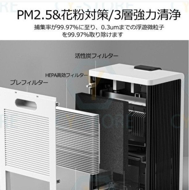 【集じん/イオン/UV除菌 空気清浄機】超細密不織布集塵フィルターにより、空気中の花粉、ほこり、アレル物質などを強力吸着、マイナスイオンを放出することで、臭いの元やカビなどを分解し、浮遊菌を減少して、部屋干しの生乾き臭を抑え、新鮮な空気を提供するなどの空気清浄効果があり。