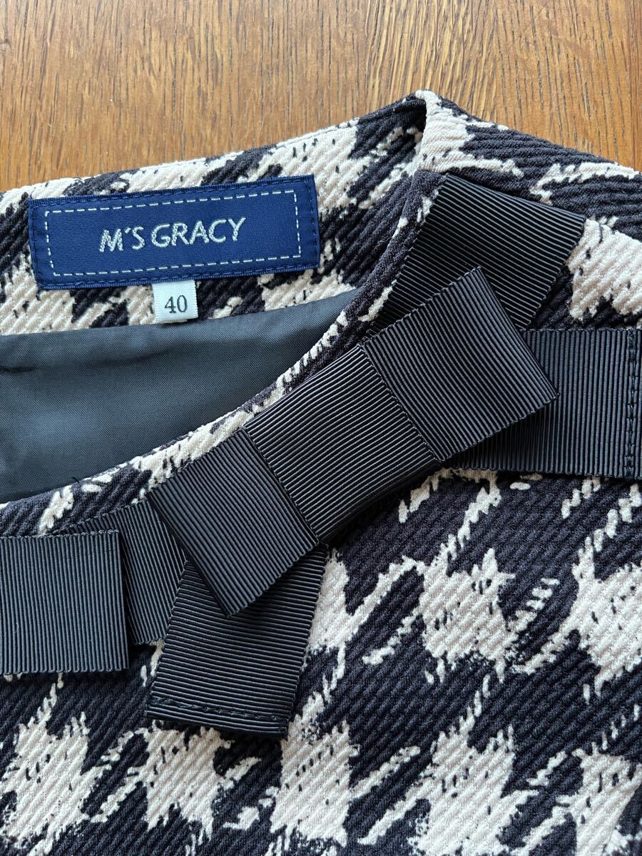 エムズグレーシーのおリボン使いが可愛いとても上品なデザインのワンピース(ベージュXブラック)です。 ポリエステル94%、ポリウレタン6%、サイズ、肩幅36cm、身幅48cm、丈109cmです。 未着用品ですが自宅保管の為、神経質な方の入札はご遠慮下さいね。 ★落札から24時間以内にご連絡をお願い致します。