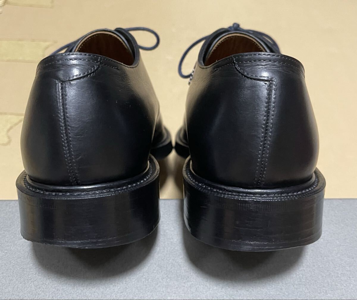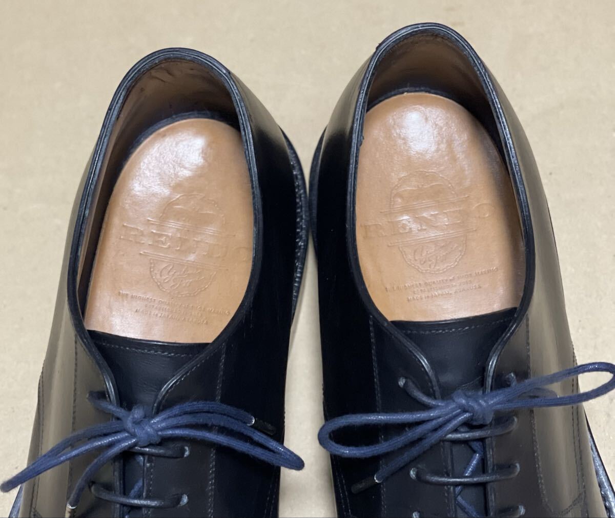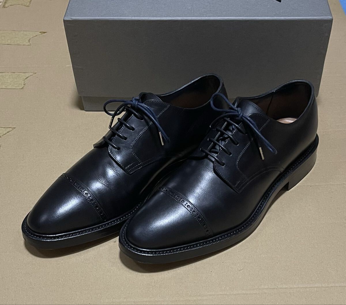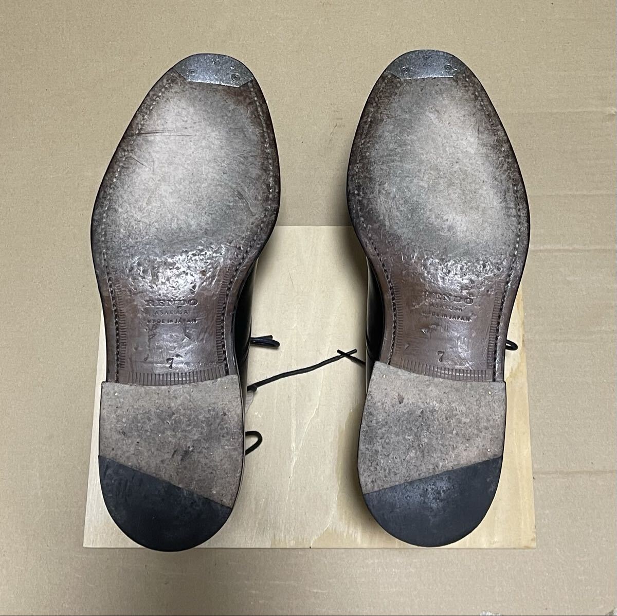 RENDOのパターンオーダー、外羽のパンチドキャップトウーです。先日出品しました内羽に続き今回は、外羽のパンチドキャップトウーを出品します。曖昧な記憶で申し訳ございませんが、購入は6〜7年くらい前で価格は7〜8万円くらいだったと思います。サイズは7 履いた感は25cmのやや細身か、24.5cmのやや幅広の方がベストサイズだと思います。