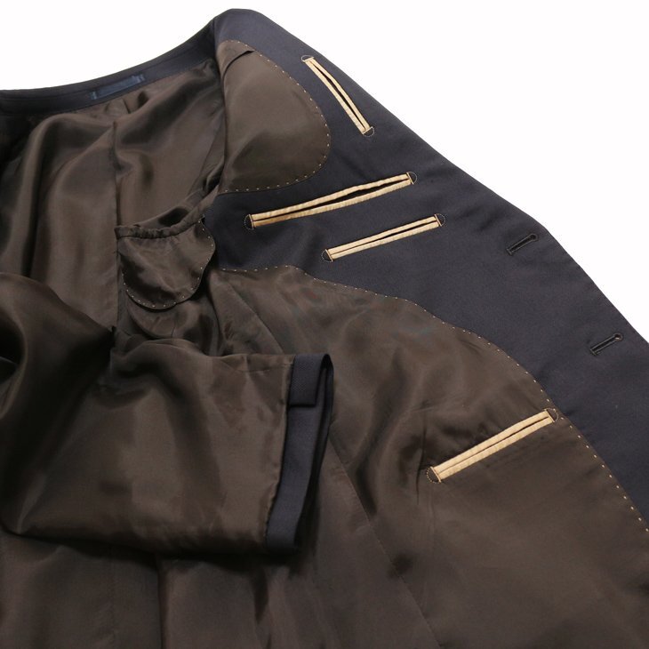 | ディテール 詳細/生産 | (上着) ・フルAMFステッチ:胸ポケット、ラペル、フロントポケット、フロントダーツ、 袖口から肩まで、肩、背裏センター縫い合わせ、サイドベンツ ・Dカン補強:フロントポケット、上着内ポケット ・ボタンは上着のフロント、内ポケット、袖口、ズボンの前後ろ本水牛ボタン ・上着のフロント裏側は力ボタン補強 ・本台場・汗止め・袖口重ね4つボタン・袖口裏額縁仕上げ・ピンポンステッチ (内装) ・フロント、袖口など各部接着芯にて補強しラペル毛芯にて全体を軽量化した上着仕様 (ズボン)ワンタック、フロント持ち出し付き、ボタンは本水牛ボタン、 シロセット加工済、股ずれ防止チョーシック、内股縫い合わせに5mmゆとり幅あり 生産国:ミャンマー製 *仕上げのプレスは、国内で施しております。 | |||||||||||