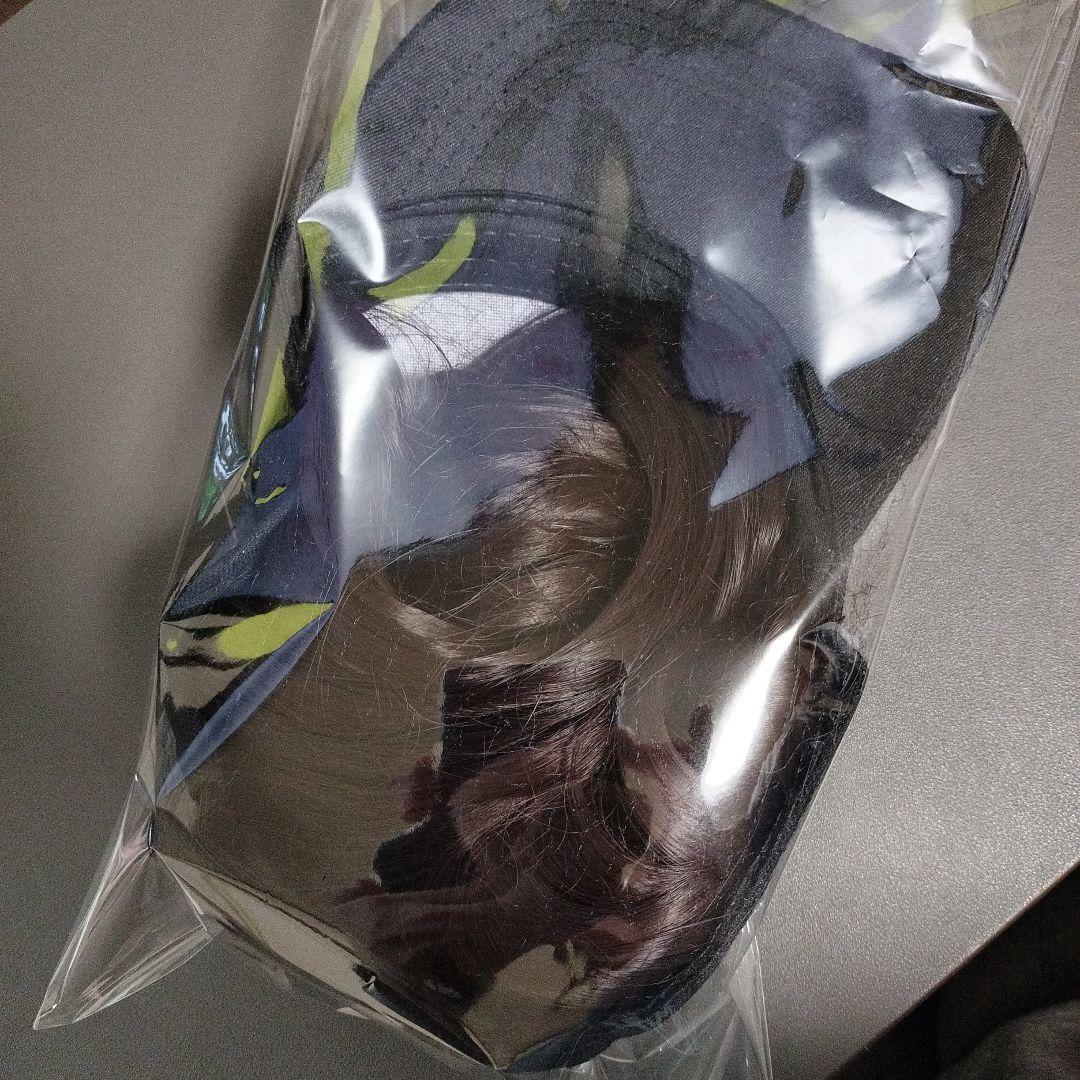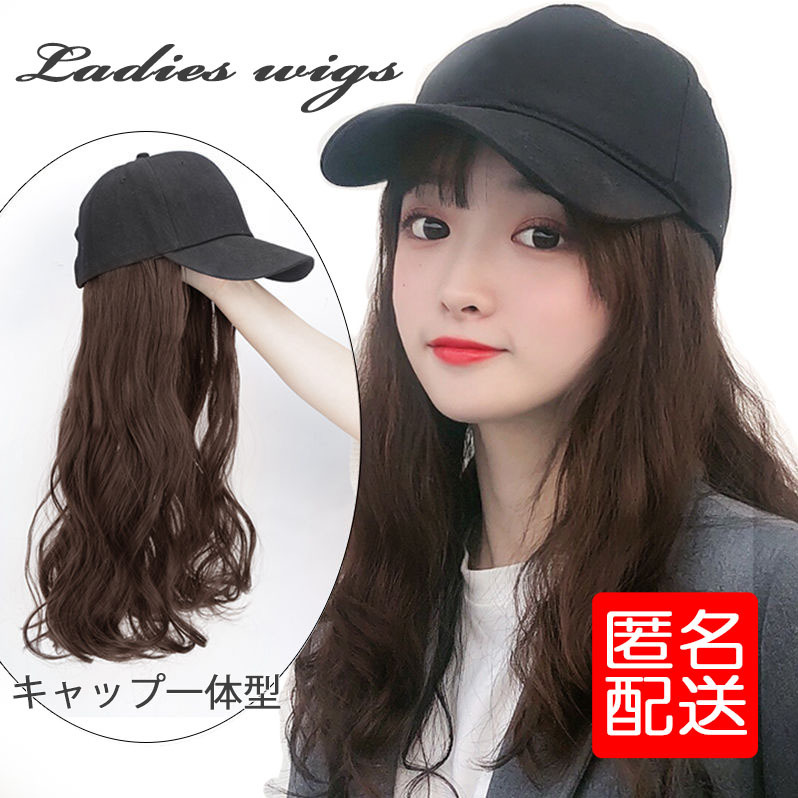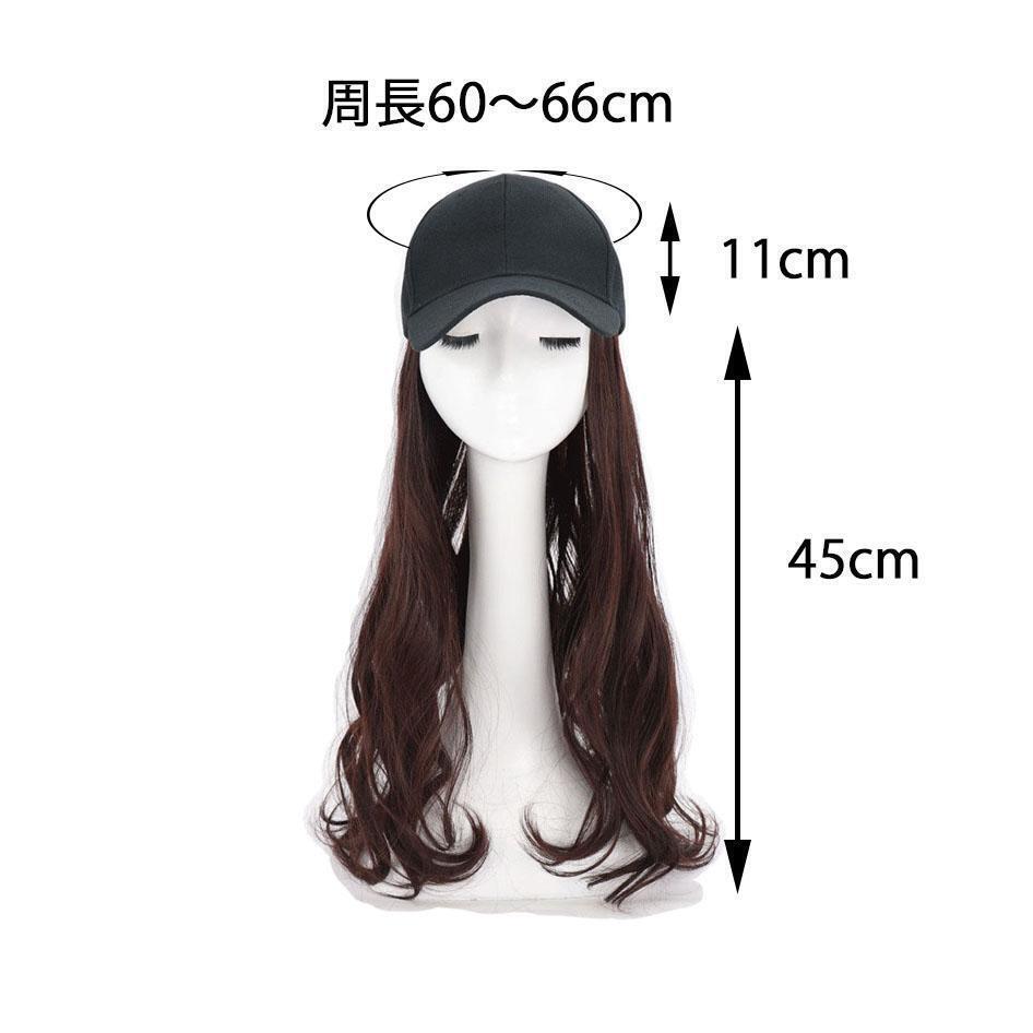 帽子付きウィッグは、自然なダークブラウンのロングヘアが特徴で、ゆるふわのスタイルが女性らしさを引き立てます。