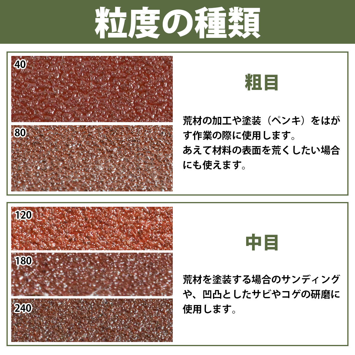 作業用途や対象素材に合わせて粒度を選択でき、作業効率が向上します。
