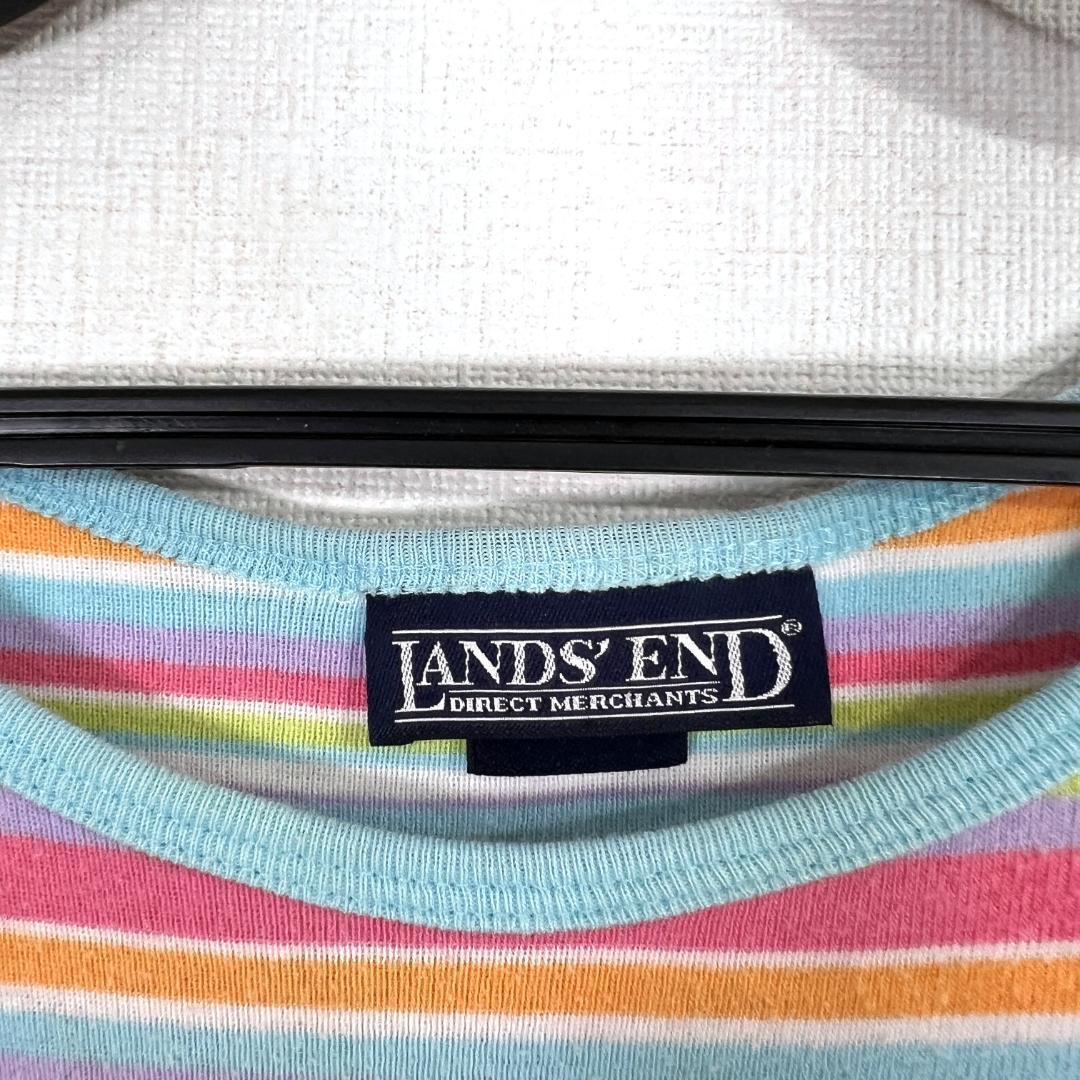 女性用のマルチカラー系のノースリーブトップス カットソー タンクトップです。カラフルなストライプ柄が特徴です。中古品ですが目立つような傷や汚れもなくまだまだ使っていただけます。古着 LANDS'END 日本ランズエンド株式会社 シンガポール製