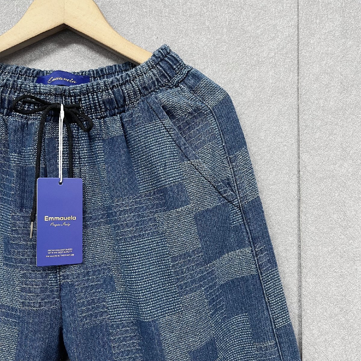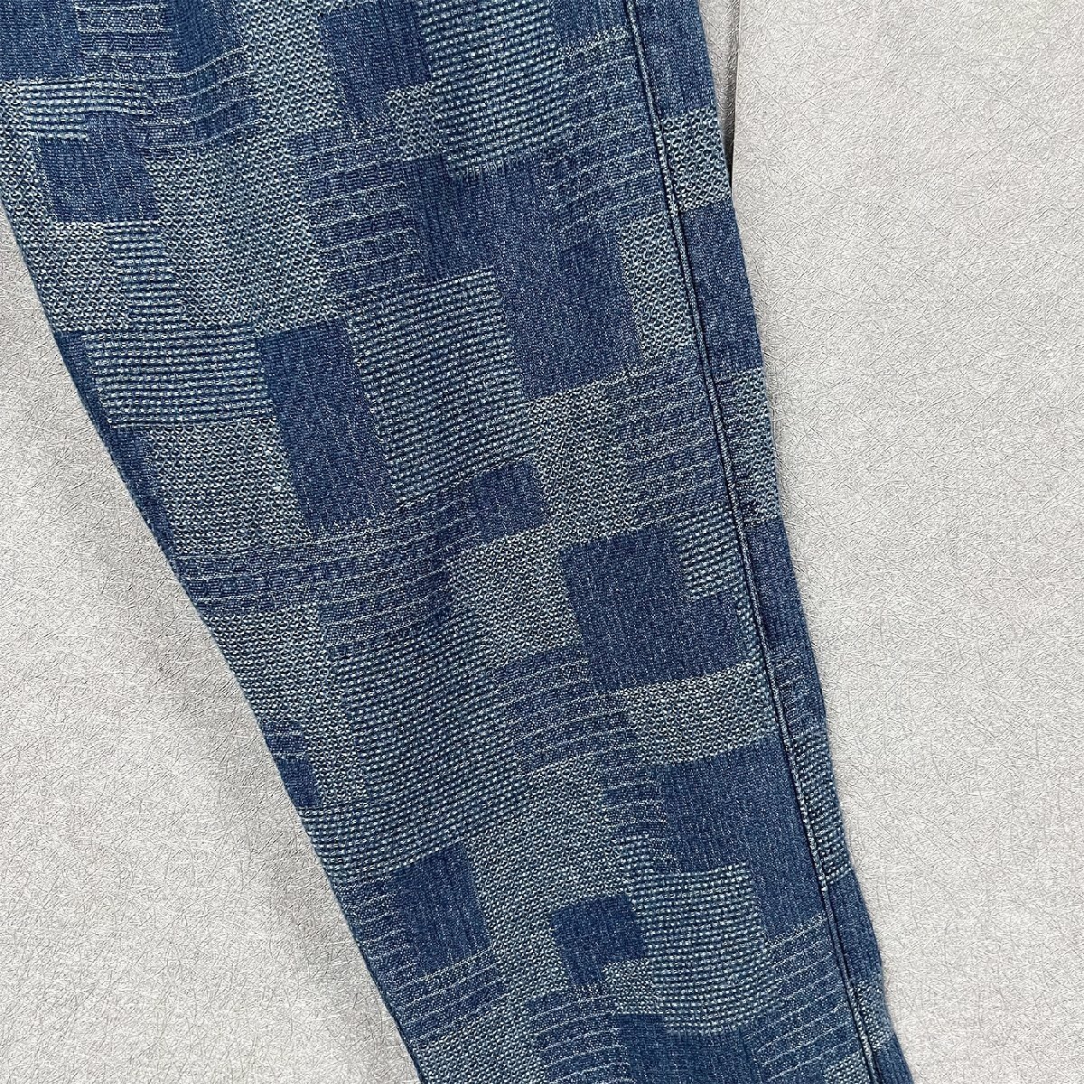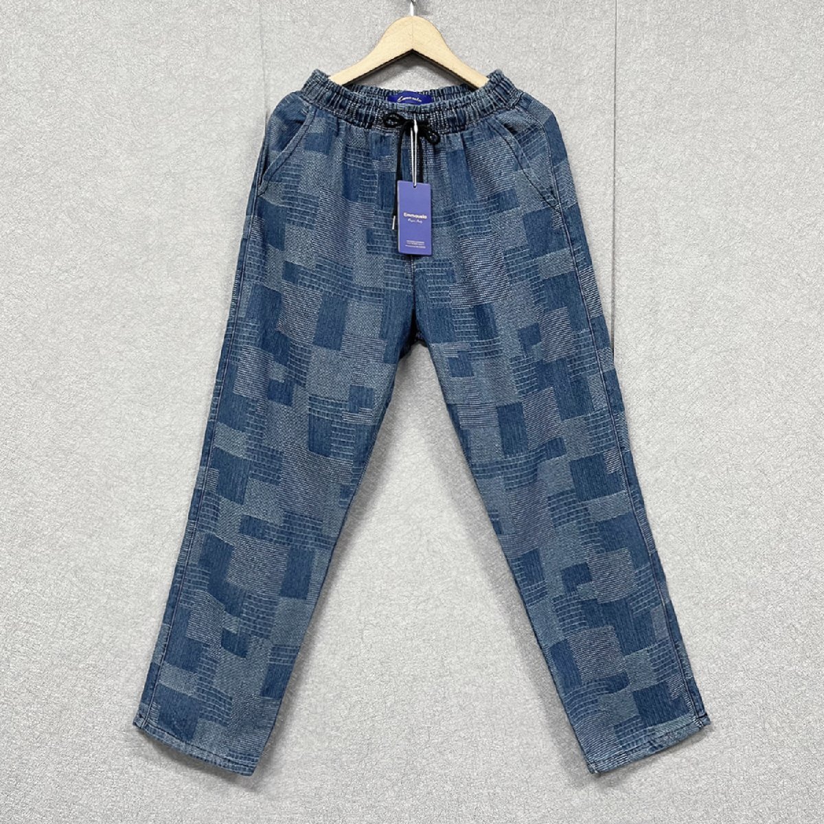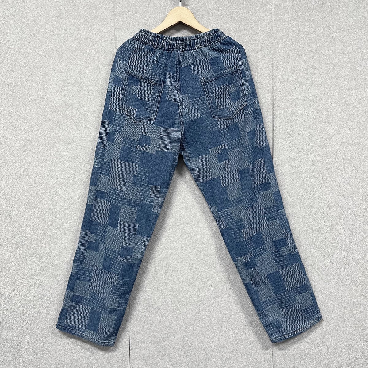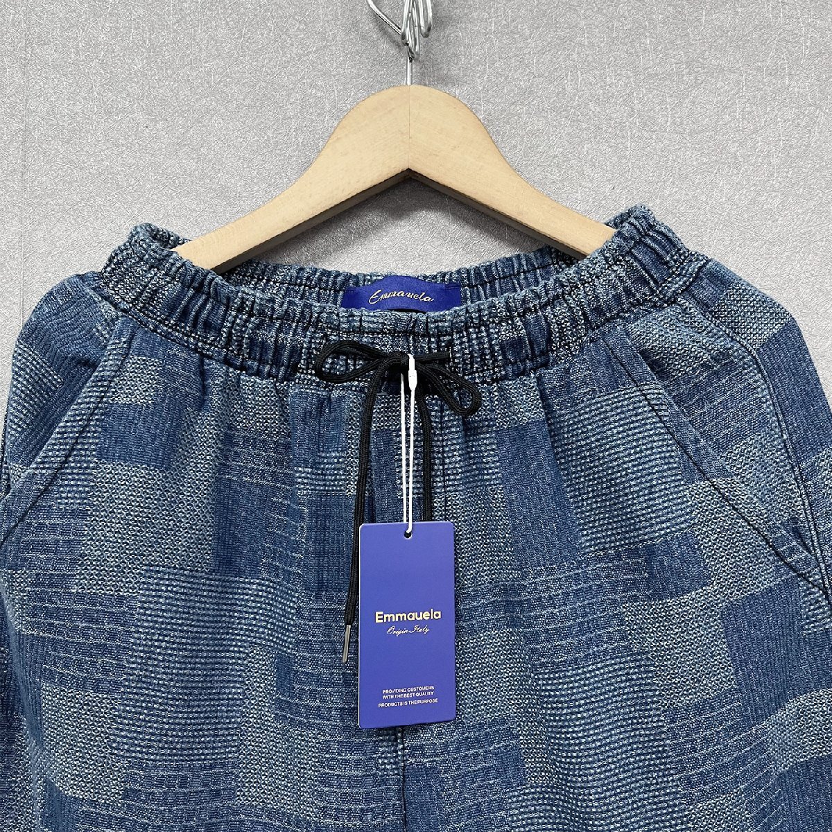 ベーシックなブルーカラーを基調とした上に、全体にはパッチワーク風のデザインが施し、レトロな雰囲気の中にも高級感を漂わせます。ウエスト部分にはゴム&紐仕様で締め付け感もなく、楽ちんです!究極の穿き心地が実現、きっと貴方のお気に入りの一本になります。両サイドとバックにポケットを付き、スマホや小物を入れたりとあると助かる便利です。