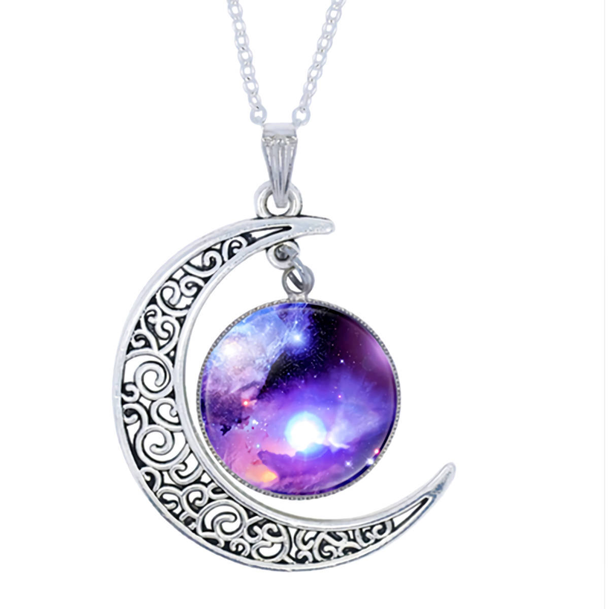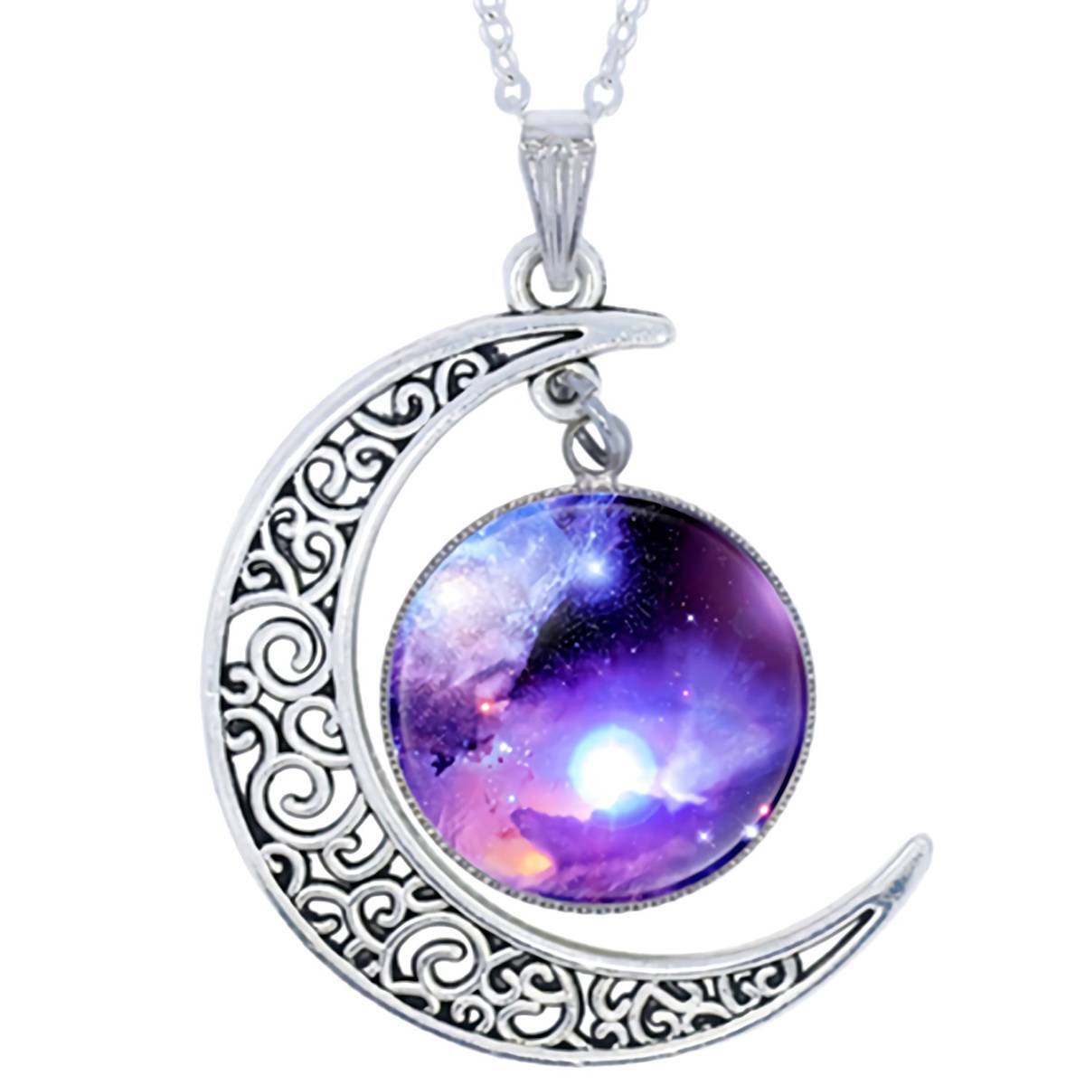 こちら銀河の輝きを閉じ込めたような、青紫フレアギャラクシー月彫ムーン925シルバーネックレスです。