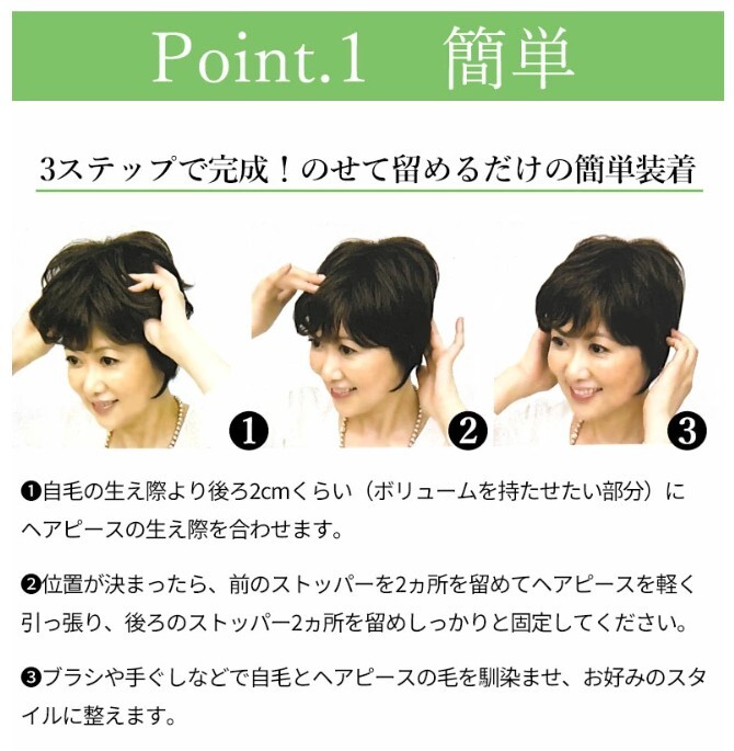 (3)ブラシや手ぐしなどで自毛とヘアピースの毛を馴染ませ、お好みのスタイルに整えます。
