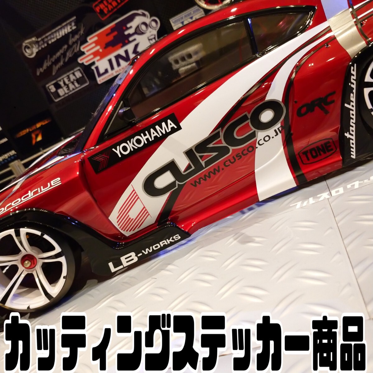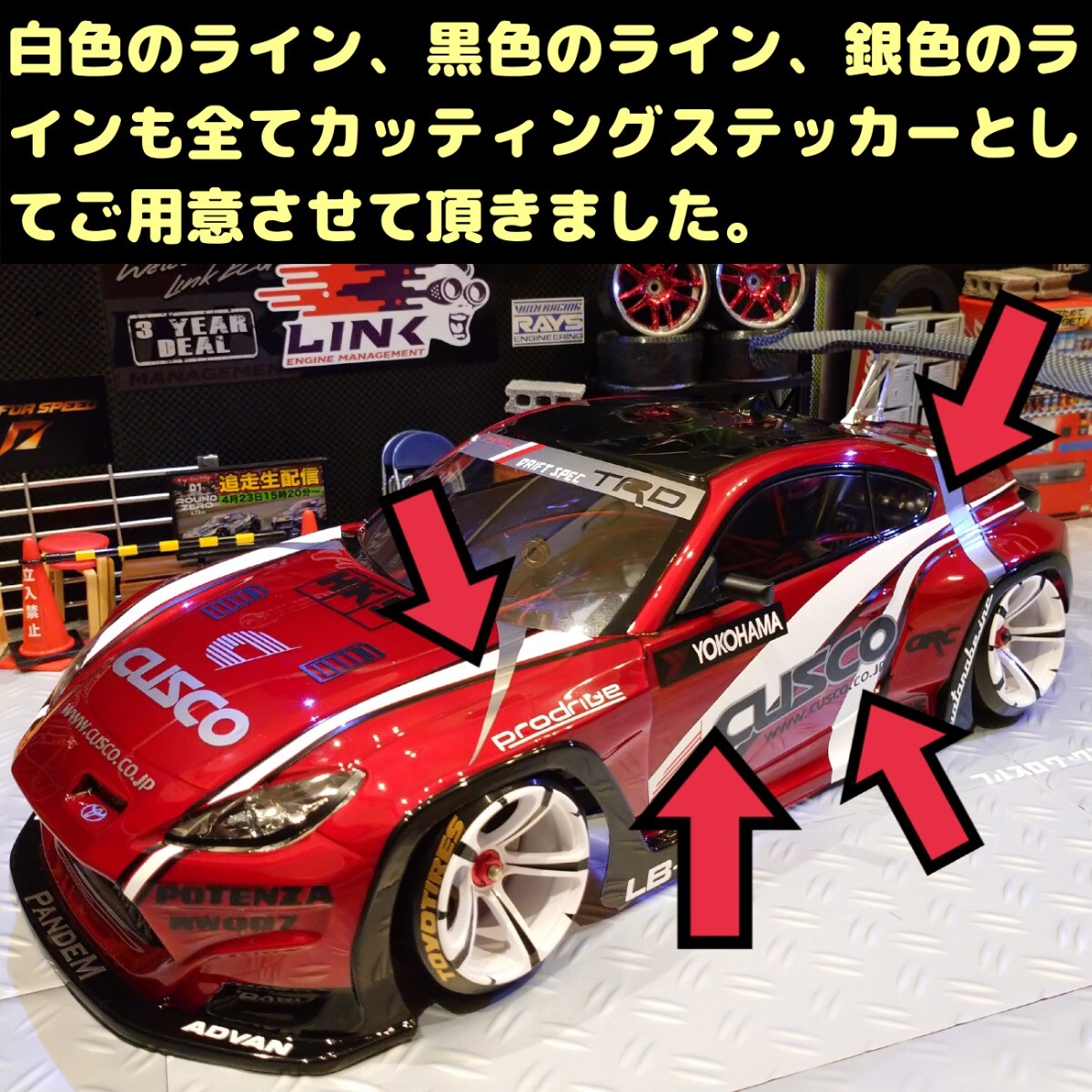 ■CUSCO Racingがフォーミュラドリフト仕様でカスタムしたGR86のホワイトボディを、レッドボディで近似再現できる1/10ドリフトラジコンボディ用のカッティングステッカー商品(但しカス取り前品)です。