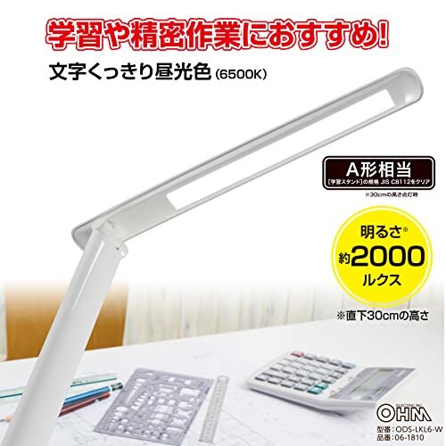特 長 ● 学習や精密作業におすすめ ● 文字くっきり昼光色(6500K) ● 明るさA形相当 ● 本体カラーはホワイト 仕 様 定格:DC18V 320mA 消費電力:7W 使用光源:高輝度チップLED使用(交換不可)昼光色(6500K) 全光束:約630ルーメン 照度:約2000ルクス(セード高さ約36cmの測定値) 本体寸法:(約)幅114×高さ370×奥行320mm 質量:約550g 付属品:専用ACアダプター(コード長=約1.5m)、書付取扱説明書