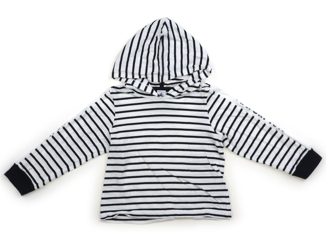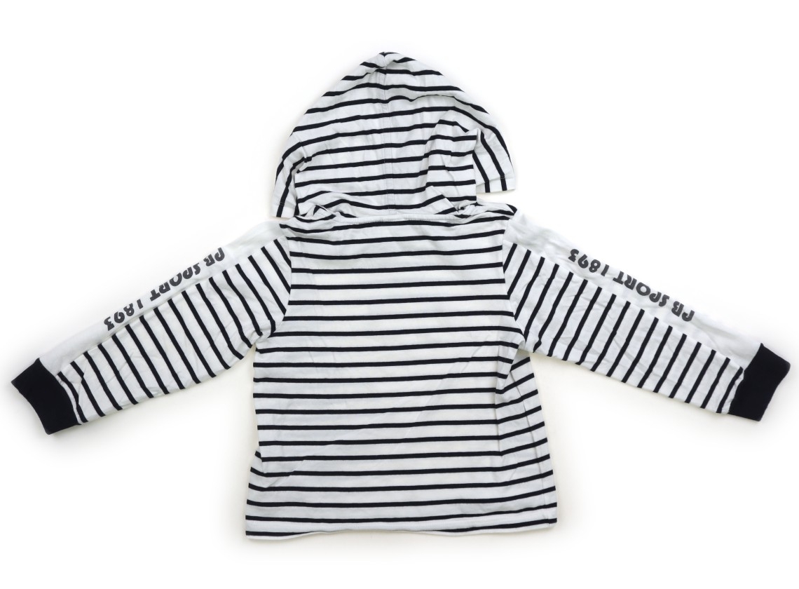 実際のサイズ表記は104cm。フードは縫い付けです。品質タグにシールはがし跡のノリ残りあり。全体に毛羽立ちありますが、目立った汚れはありません。
