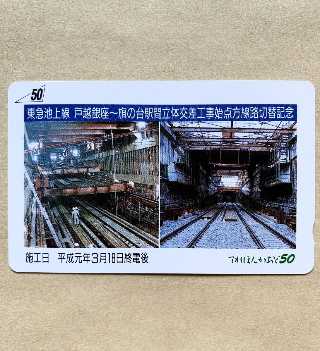 【未使用】 鉄道テレカ 50度 東京急行電鉄 東急 東急池上線 戸越銀座~旗の台駅間立体交差工事 線路切替記念 平成元年3月18日終電後
