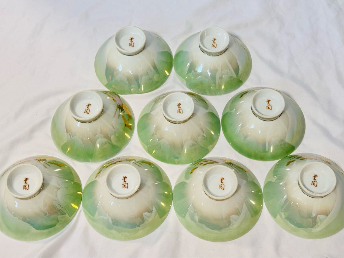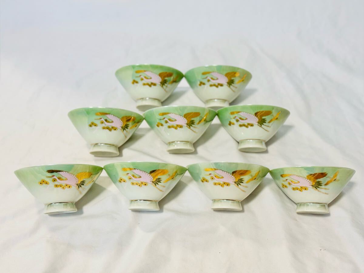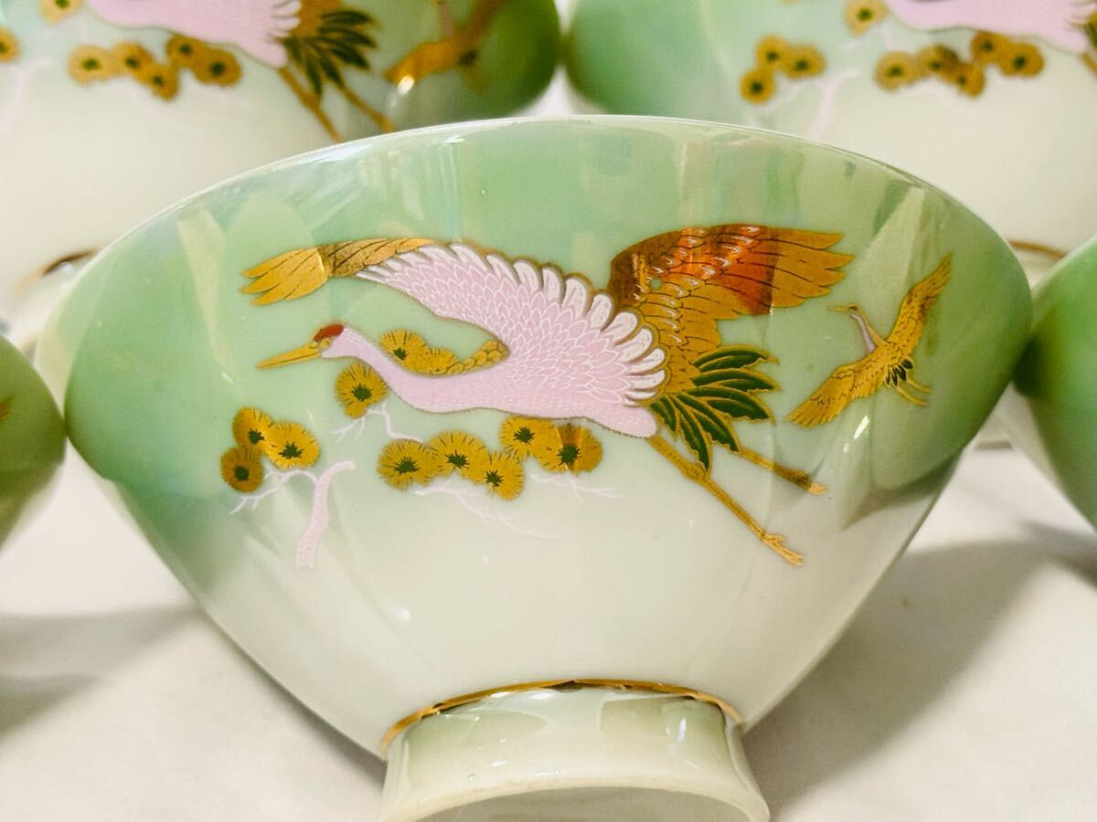 未使用 陶磁器 金彩 鶴文 ご飯茶碗 9個 9客 セット 縁起物 金縁 緑 白磁 鶴 | |||