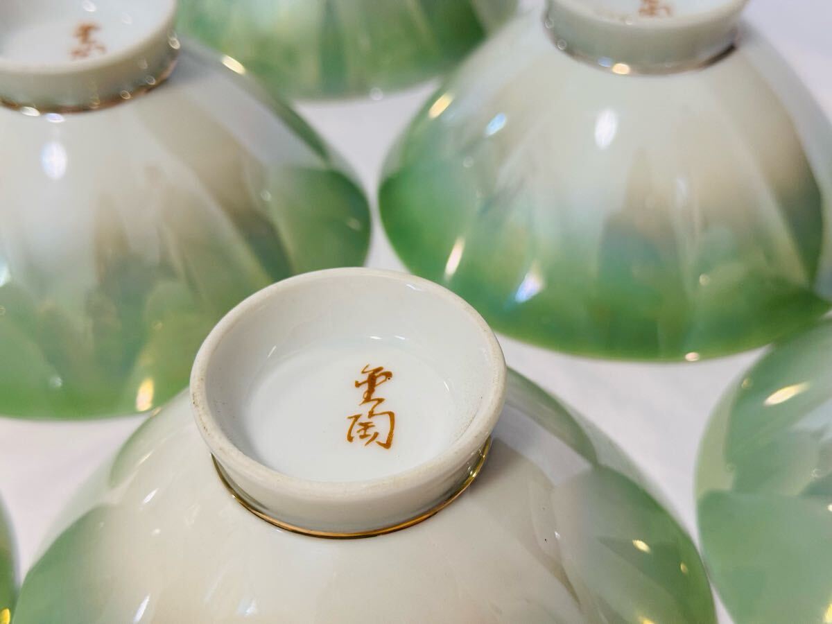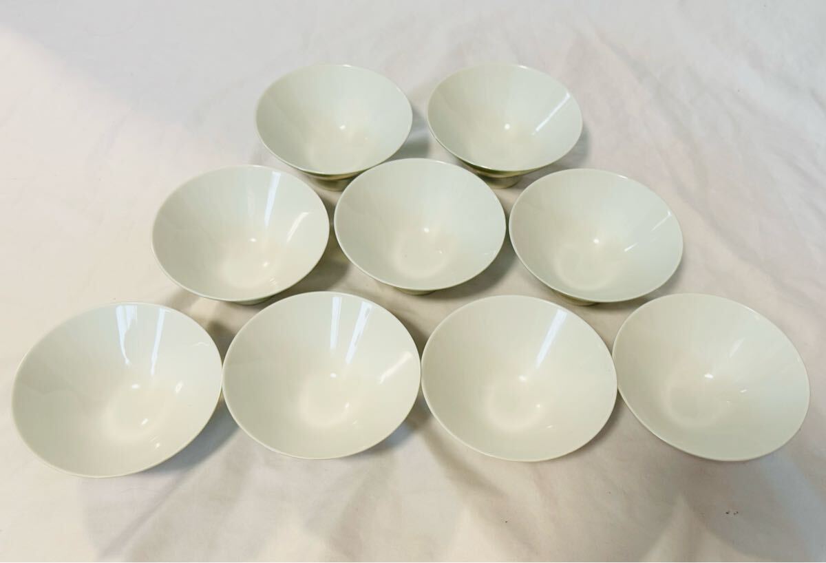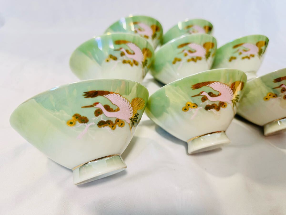 未使用 陶磁器 金彩 鶴文 ご飯茶碗 9個 9客 セット 縁起物 金縁 緑 白磁 鶴 | |||