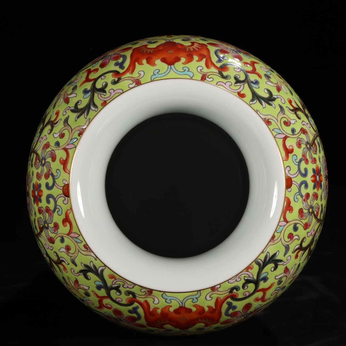 「清 乾隆年製 陶磁器 粉彩黄地纏枝蓮福壽 双耳瓶」染付 置物 擺件 古賞物 中国古美術 旧蔵出