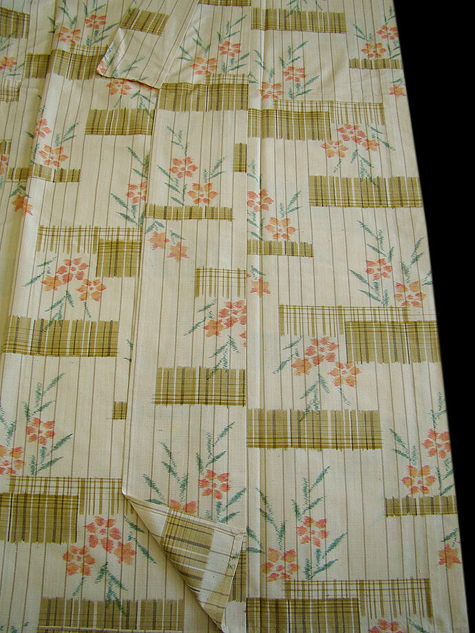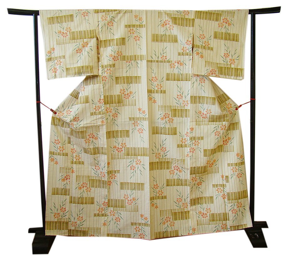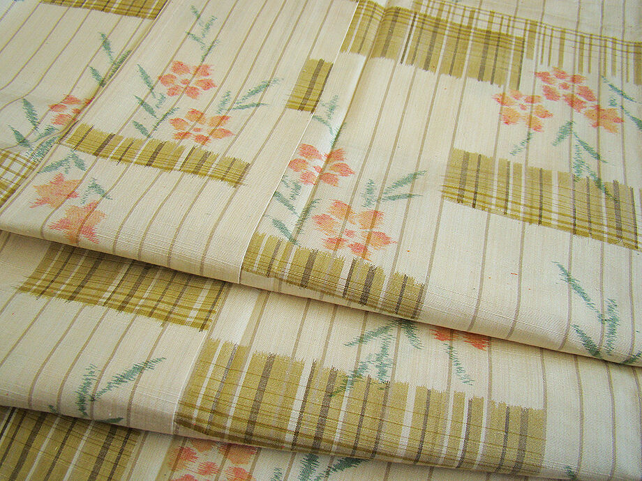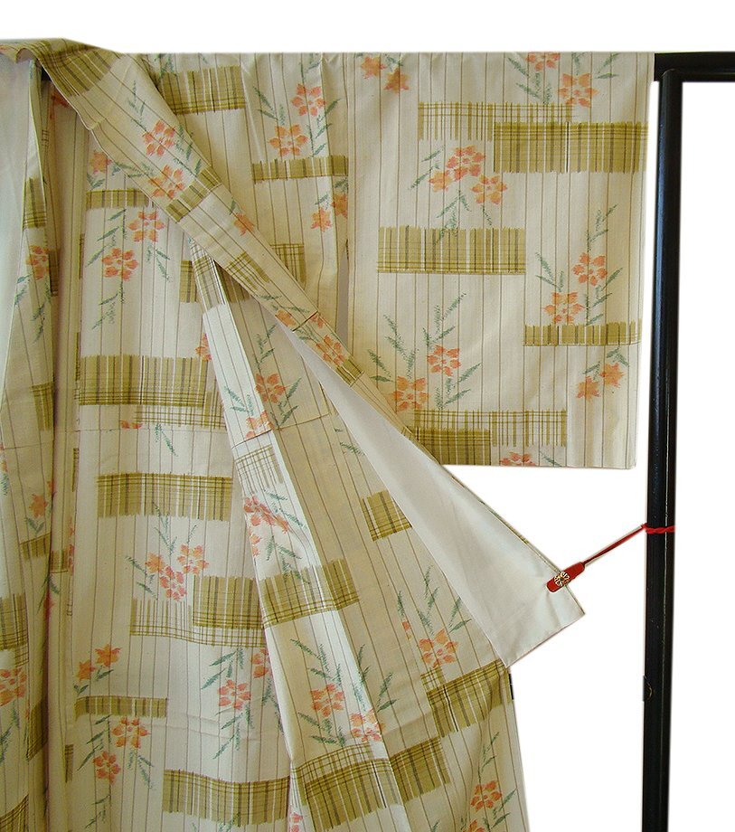| 商品説明 | こちらのお品は「単衣」ですので5月、6月、9月にお召頂ければと思います。 着物には、大きく分けて「袷(あわせ)の着物」と「単衣(ひとえ)の着物」と「夏着物」があります。 反物(表地)を着物に仕立てるときに、裏地類をつけるものを袷の着物、 つけないものを単衣の着物と呼び、胴裏や八掛といった裏地がつかない一枚ものの着物です。 また裏地がないため、座る時などにヒップのラインが目立たないよう、 居敷当て(いしきあて)の生地をつけることもあります。 居敷当ては付いておりません。 しなやかでさらりとして手触り良く着心地良い涼やかな風合いの十日町紬地、 クリーム色地に赤、黄土、緑色等の花草柄の織柄が洒落感高い着物姿を演出しております。 裄が長めとなっております。 |
